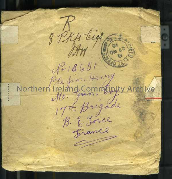 Large envelope folded down and addressed to James on both sides, along with ‘8 Pkts Cigs’. Stamped over address ‘Present location uncertain’, with ‘H… – 167b