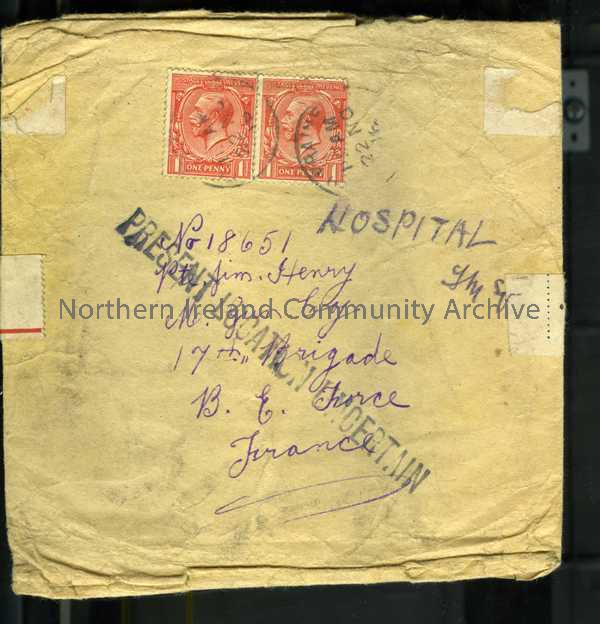 Large envelope folded down and addressed to James on both sides, along with ‘8 Pkts Cigs’. Stamped over address ‘Present location uncertain’, with ‘H…