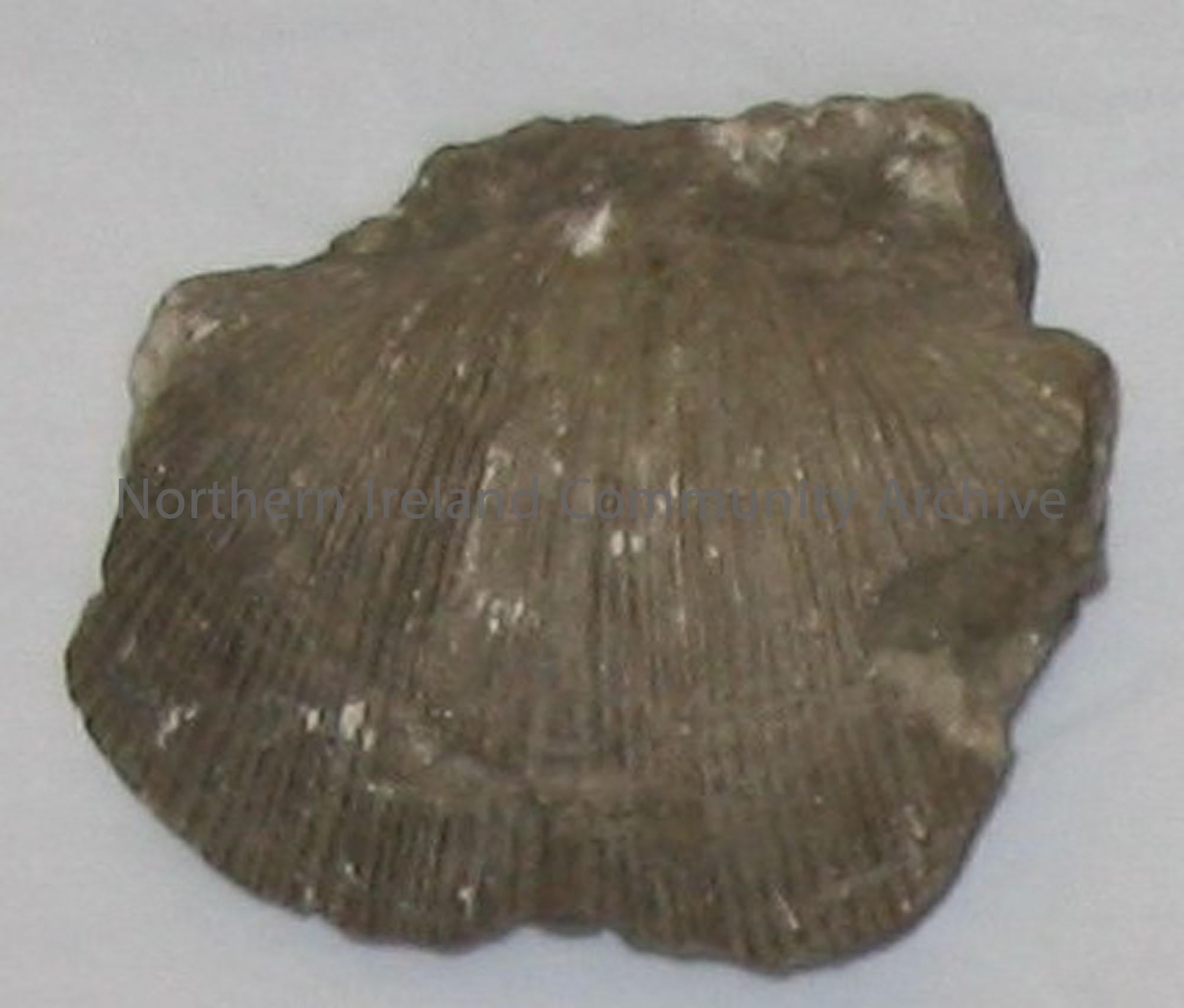 large fossil bivalve shell, chipped at corners, crystals growing within shell