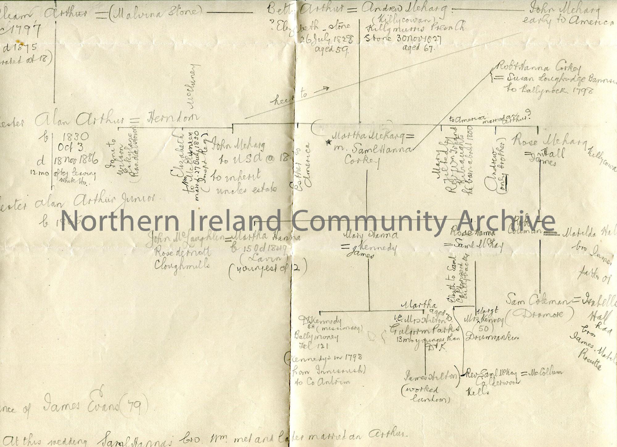 Large handwritten family line of Arthurs/Mehargs/Hannas/Colemans. [Exactness of relationships uncertain] – img805b