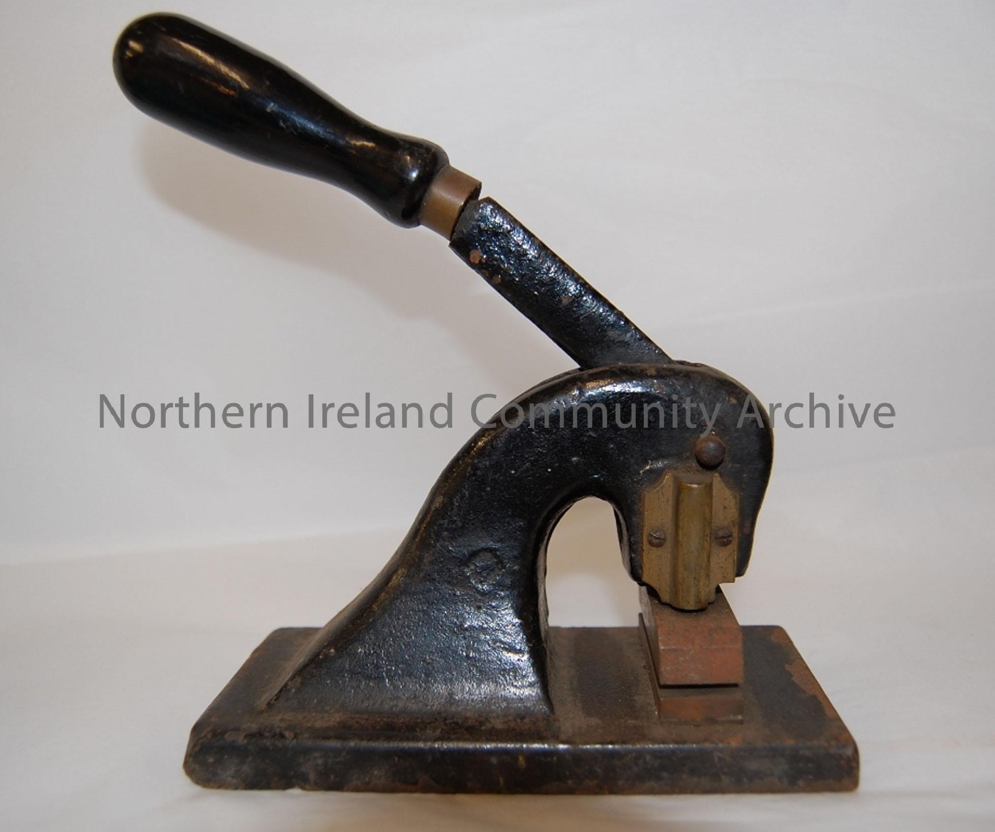 Large lever press painted black and decorated with floral design.