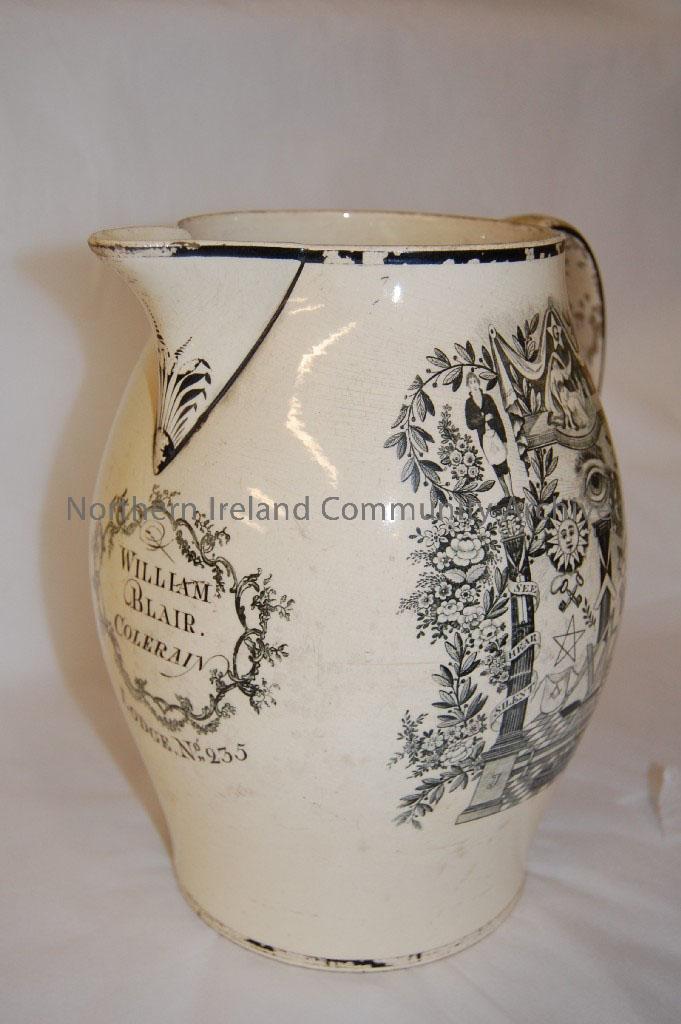 Large off white jug with masonic symbols printed on it. Masonic ale jug|see below for details – 1992.123