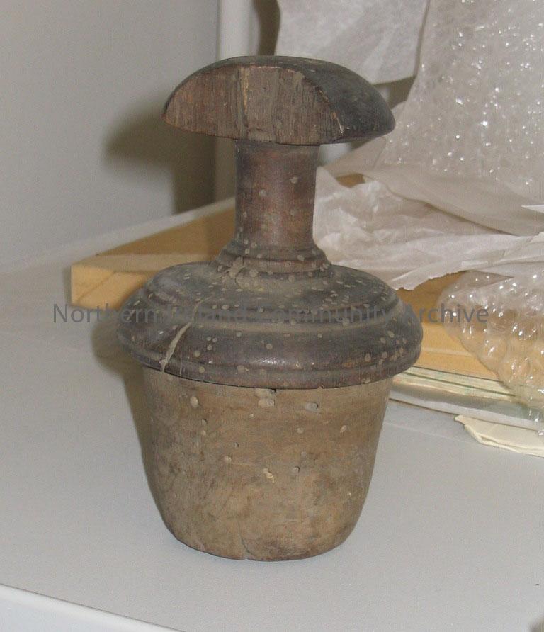 Large piece of handle missing from lid and evidence of wood worm. – 1992.171