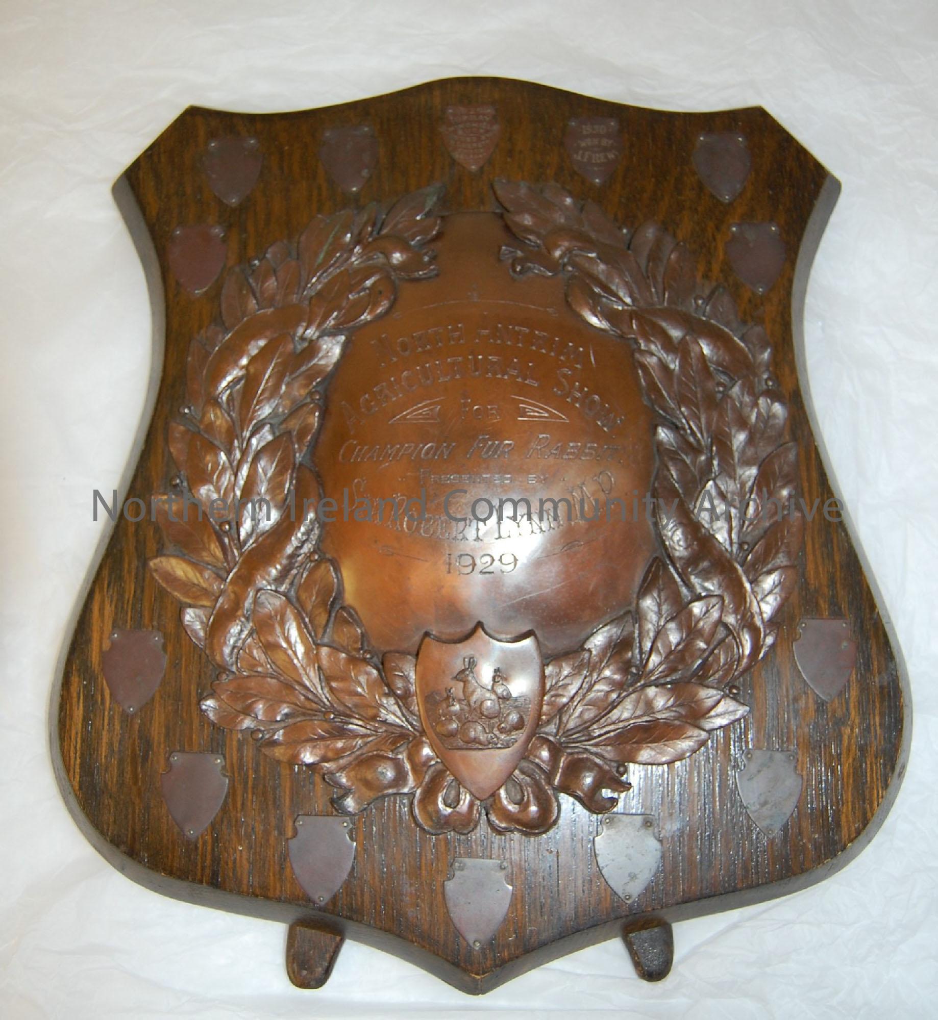 Large wooden shield, overlaid with brass in the shape of a wreath. It is inscribed, "North Antrim Agricultural Show for Champion fur rabbit presented by Sir Robert Lynn MP, 1929". Also includes motif with six rabbits.