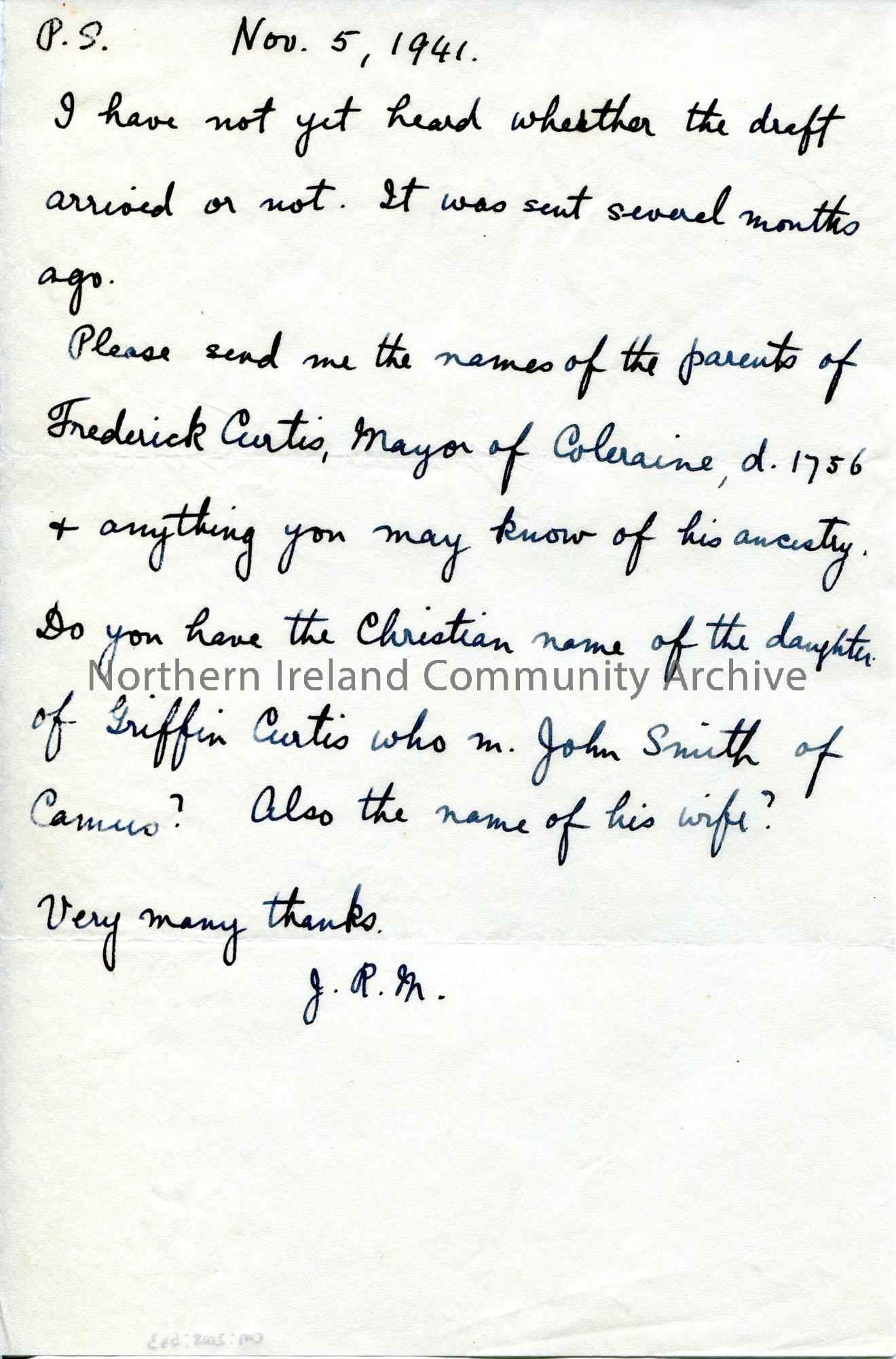 Last page of a letter from J. R. M (other pages are missing). Seeking genealogical information re Frederick Curtis, Mayor of Coleraine and Griffin Curtis.