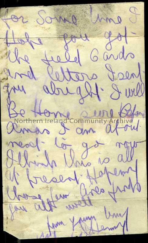 Last page only of a handwritten letter in purple pencil from James to his father (envelope addressed to him). Hopes they got field cards he sent and should be home before Christmas