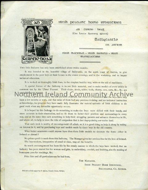 Explanatory leaflet about "the Irish peasant home industries" - says they have only been establisehed in the past 12 months. Part of a collection of headed paper booklets and notes from the Irish Home Industries, Ballycastle. Courtesy of Ballycastle Museum.