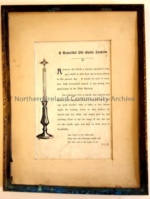 A Beautiful Old Gaelic Custom - A framed write up of the tradition of lighting a candle and placing it in the window on Christmas Eve, to show that there is a welcome for any mother and child who might be seeking shelter and especially the Christ Child. Frame possibly made from bronze (slight verdigris). Written by F J Bigger. Courtesy of Ballycastle Museum.