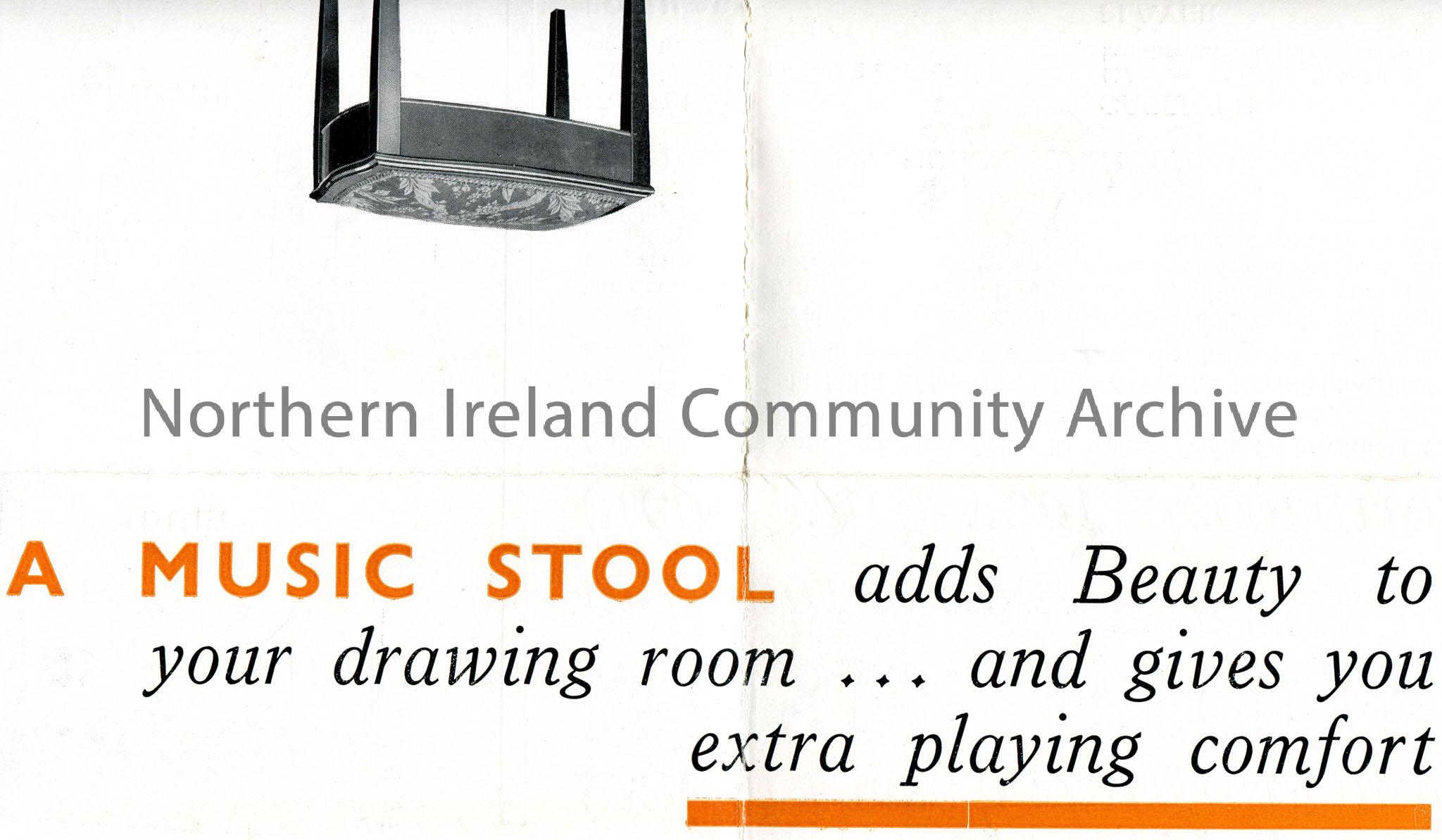 Leaflet for music stools for pianos by Monington & Weston, London. Black and white images of the music stools. X marked against the ‘Artiste’ stool an… – scan016c