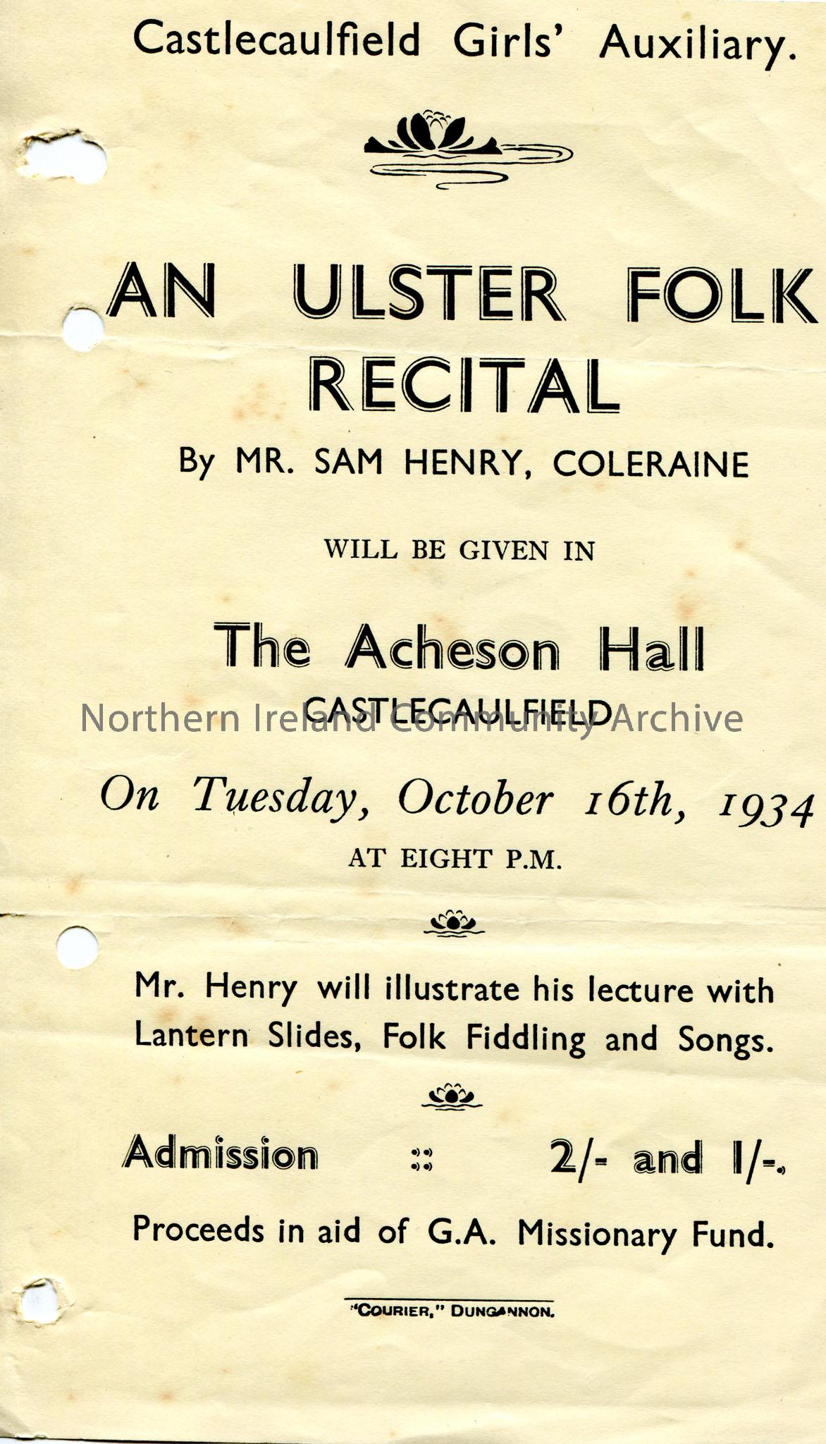 Leaflet or flyer for Castlecaulfield Girl's Auxiliary. A lecture titled, 'An Ulster Folk Recital' by Sam Henry in The Acheson Hall, Castlecaulfield. Tuesday, 6th October, 1934. Involved lantern slides, folk fiddling and songs.