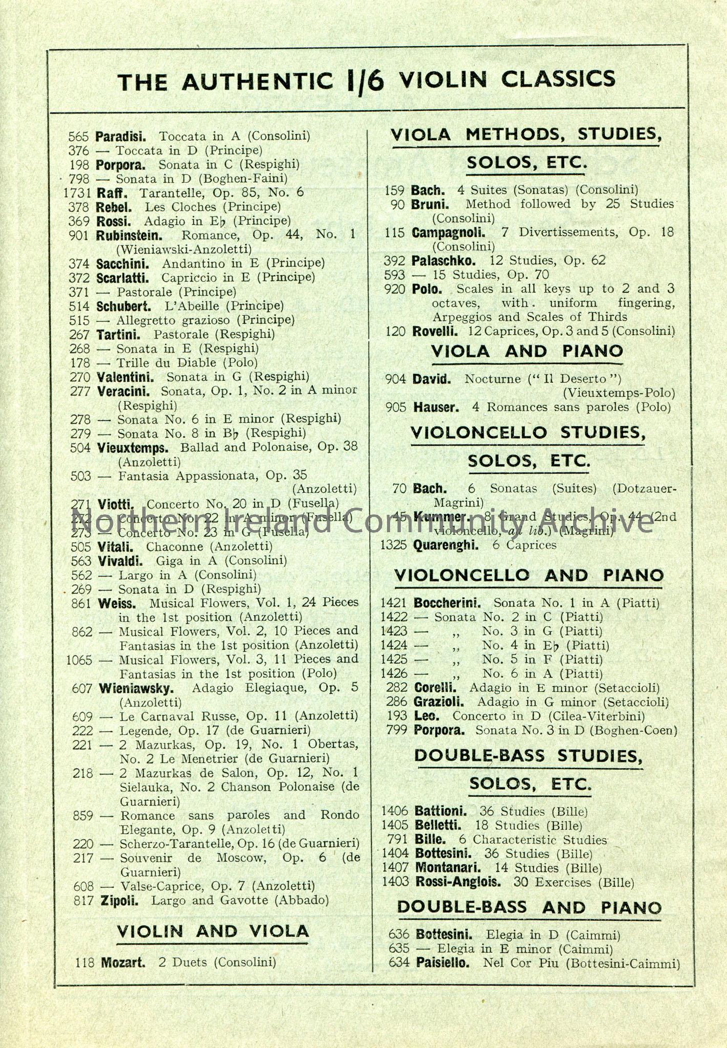 Leaflet, printed on green/blue coloured paper titled, 'The Authentic 1/6 Violin Classics With sections for Viola, Violoncello and Double-Bass. The Recognised Series for Correct Tuition or Performance of the World's Violin Classics'. Lists of stringed instruments. Rushworth & Dreaper, Ltd.
