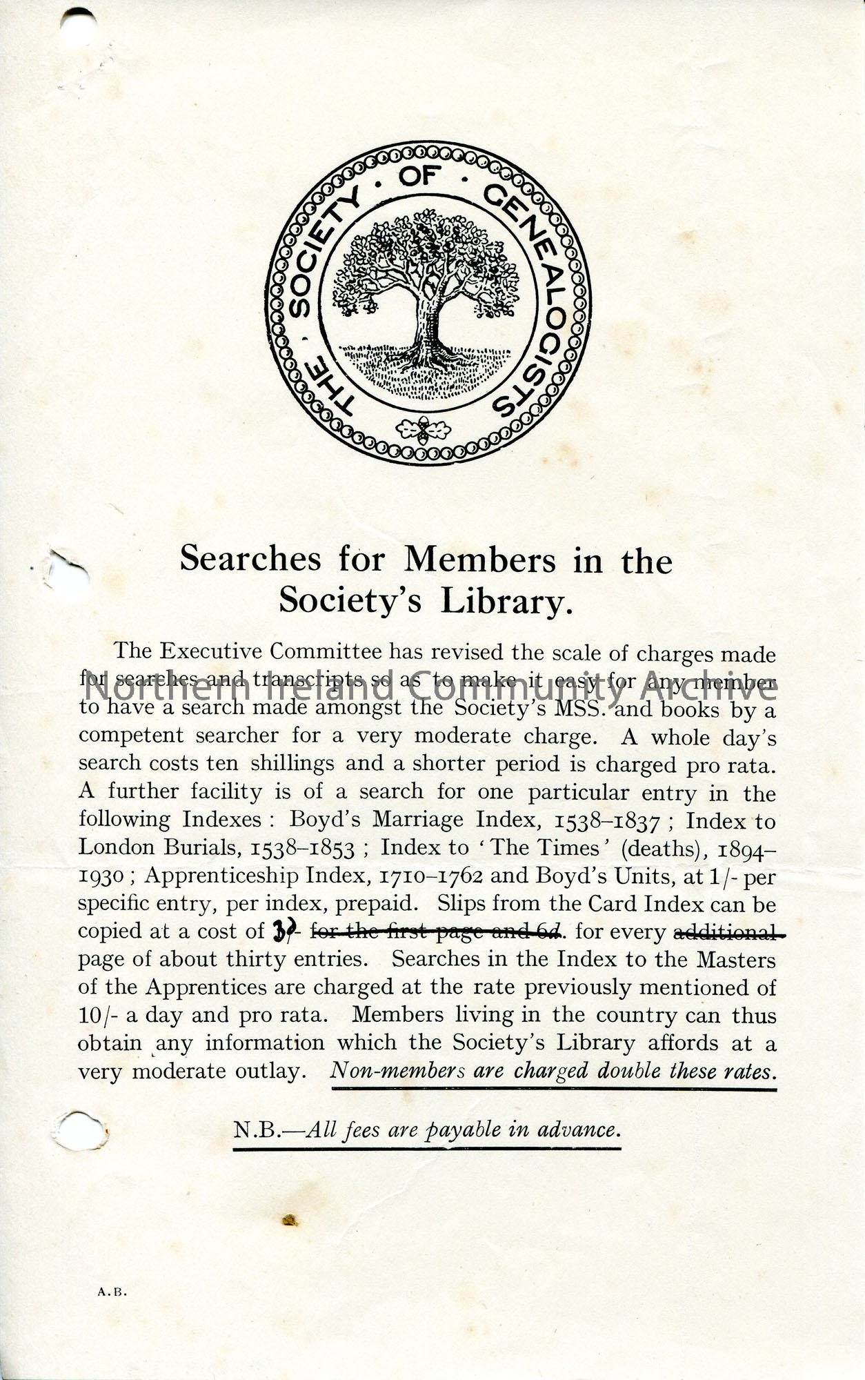 Leaflets on information for ‘Searches for Members in the Society’s Library’ – The Society of Genealogists. Re the charges for searches made and transc…