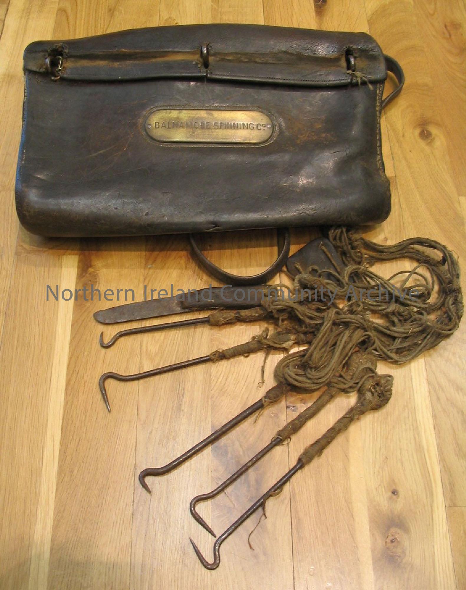 Leather bag with strap, with brass badge “Balnamore Spinning Co” on front, bar used to fasten, used for delivering mail to Mill.