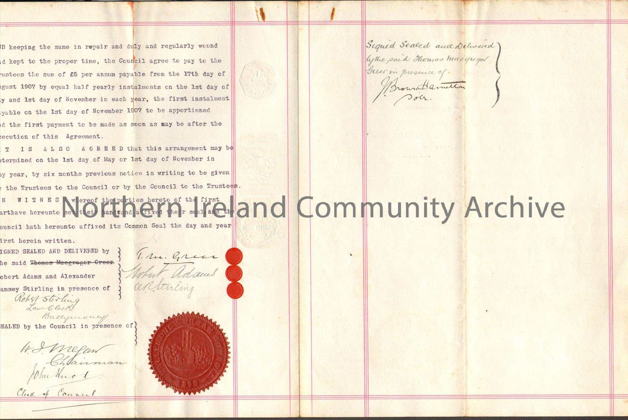 Legal agreement between Thomas MacGregor Greer, solicitor, Robert Adams, jeweller, Alexander Ramsey, Stirling merchant and Ballymoney Urban District C… – 2014.225 (1)