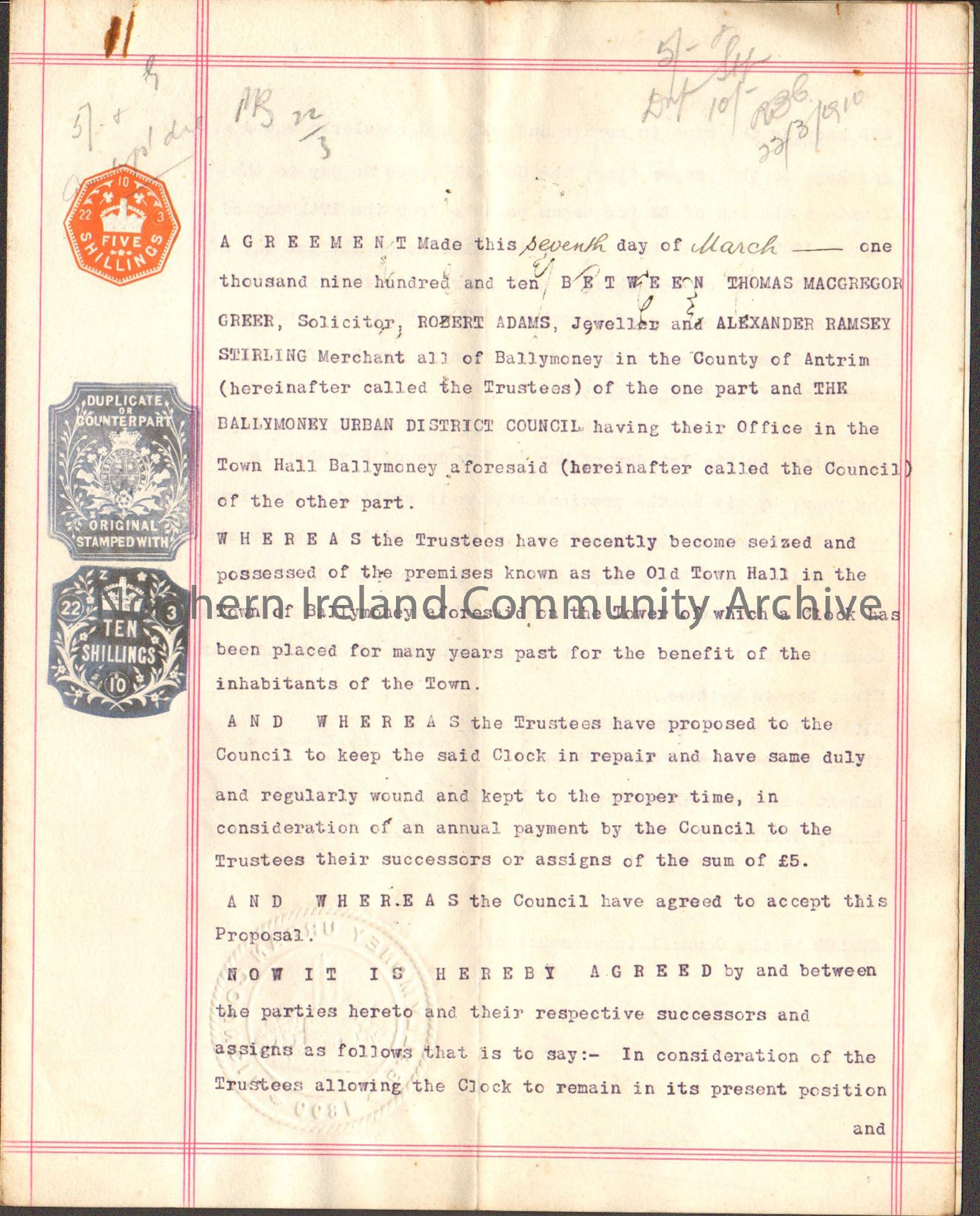 Legal agreement between Thomas MacGregor Greer, solicitor, Robert Adams, jeweller, Alexander Ramsey, Stirling merchant and Ballymoney Urban District Council regarding the winding of the Old Town Hall clock (Masonic Hall).Features three stamps on front - red five shillings, black duplicate or counterpart and black ten shillings