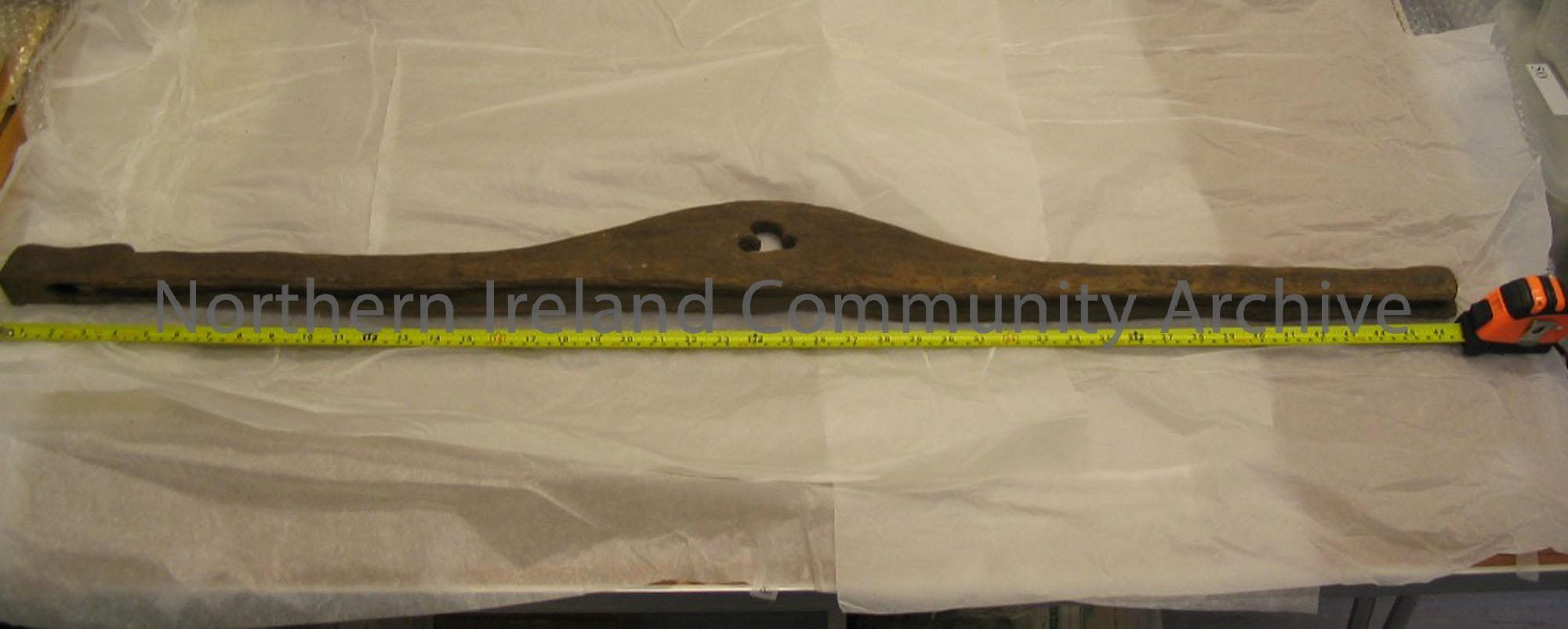 Length of wood with one straight edge and a curved edge pierced in the middle.
