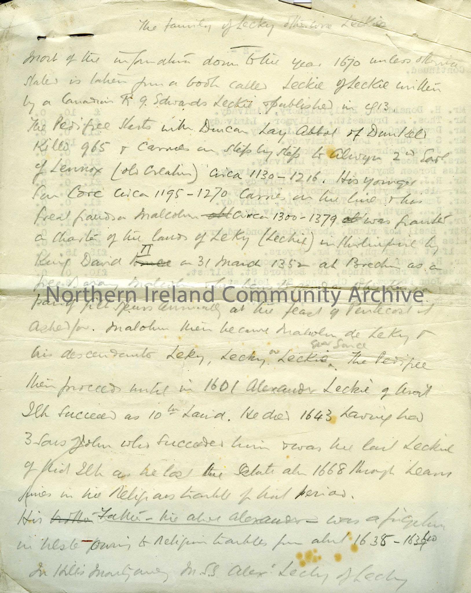 letter detailing the family tree fo the Lecky family. With documents maping names and movements of address