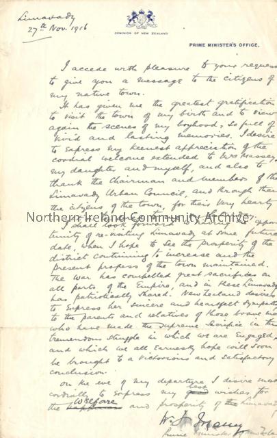 Letter written by William Ferguson Massey, 27 November 1916. “I accede with pleasure to your request to give you a message to the citizens of my native town. It has given me the greatest gratification to visit the town of my birth and to view again the scenes of my boyhood, so full of vivid and lasting memories. I desire to express my keenest appreciation of the cordial welcome expressed to Mrs. Massey, my daughter and I myself and alas to thank the chairman and members of the Limavady Urban Council and through them the citizens of the town for their very hearty invitation tendered to me on Saturday. I shall look forward to having the opportunity of revisiting Limavady at some future date, when I hope to see the prosperity of the district continuing to increase and the present hopes of the town maintained. The war has compelled great sacrifices on all parts of the empire and in these Limavady has patriotically shared. New Zealand deserves to express her sincere and heartfelt sympathy to the parents and relatives of those brave men who have made the supreme sacrifice in the tremendous struggle in which we are engaged and which we all earnestly hope will soon be brought to a victorious and satisfactory conclusion. On the eve of my departure I desire most cordially to express my best wishes for the welfare and prosperity of Limavady.” Donated by Mr. D. Boyd. Mr. Boyd's grandfather, J.D. Boyd was the clerk for Limavady Urban District Council at the time.