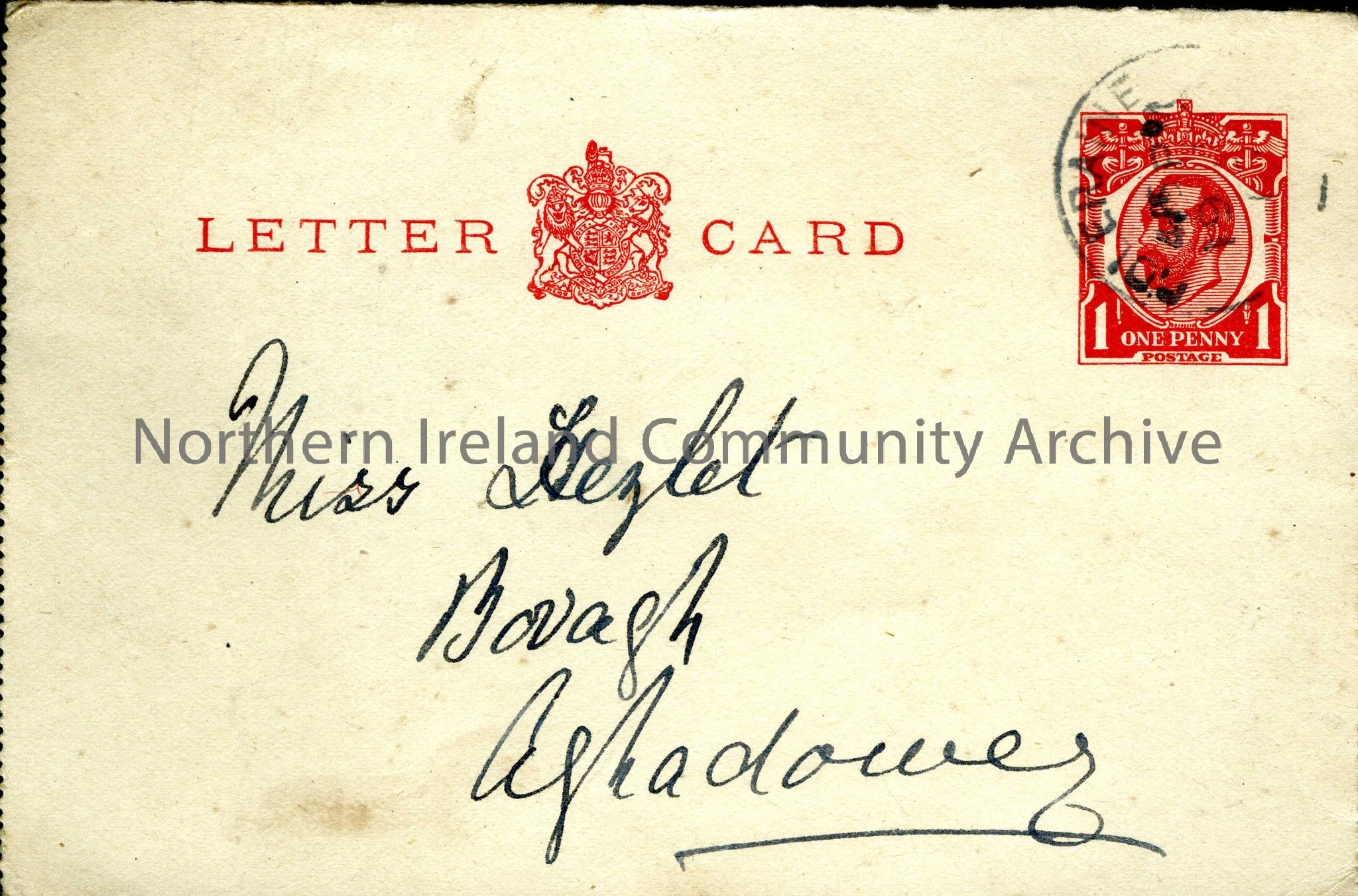 Letter card from a friend. Undated. mentions lack of petrol, K-tarna and Glandore.