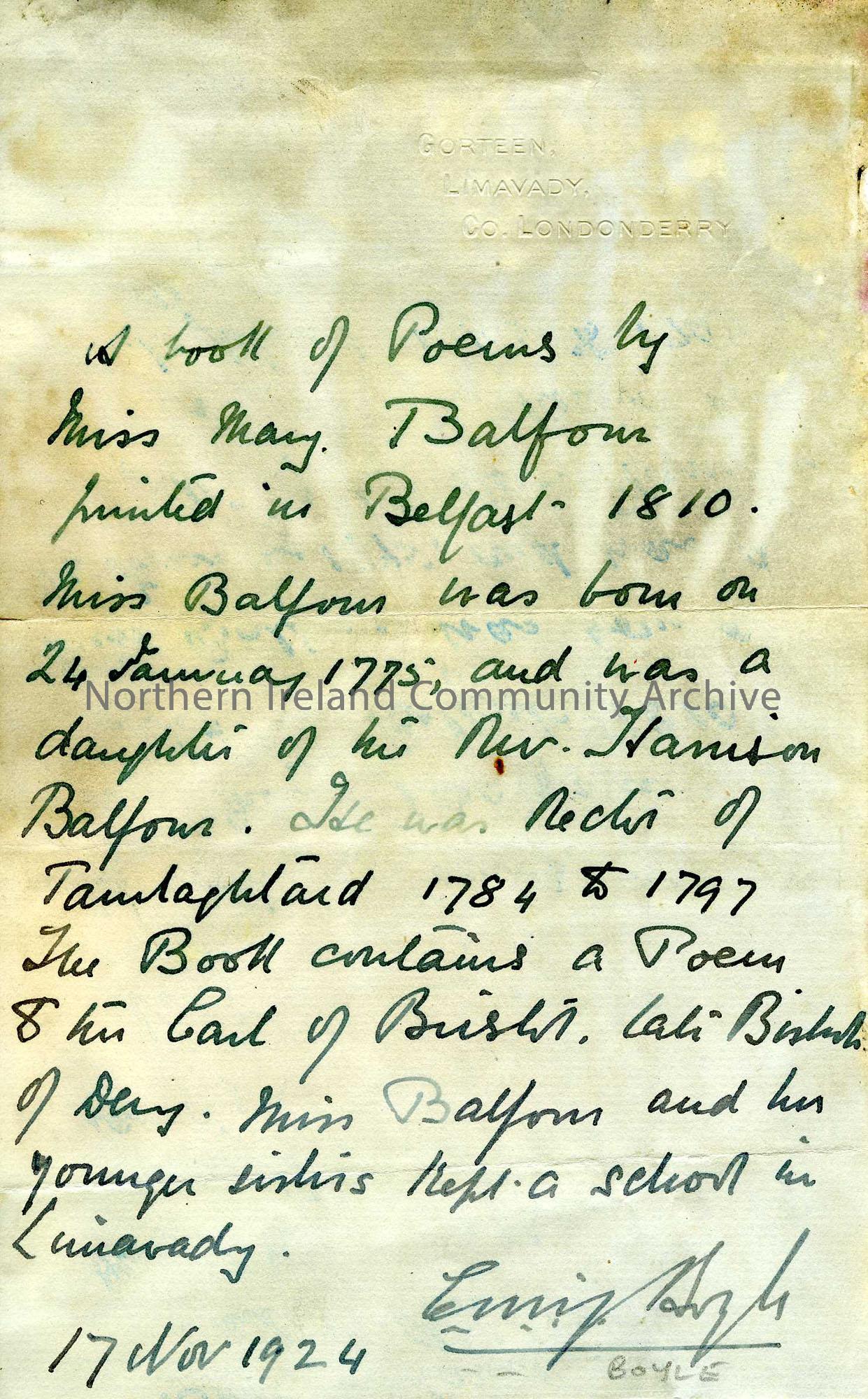 letter describing poetry book by Miss May Balfour