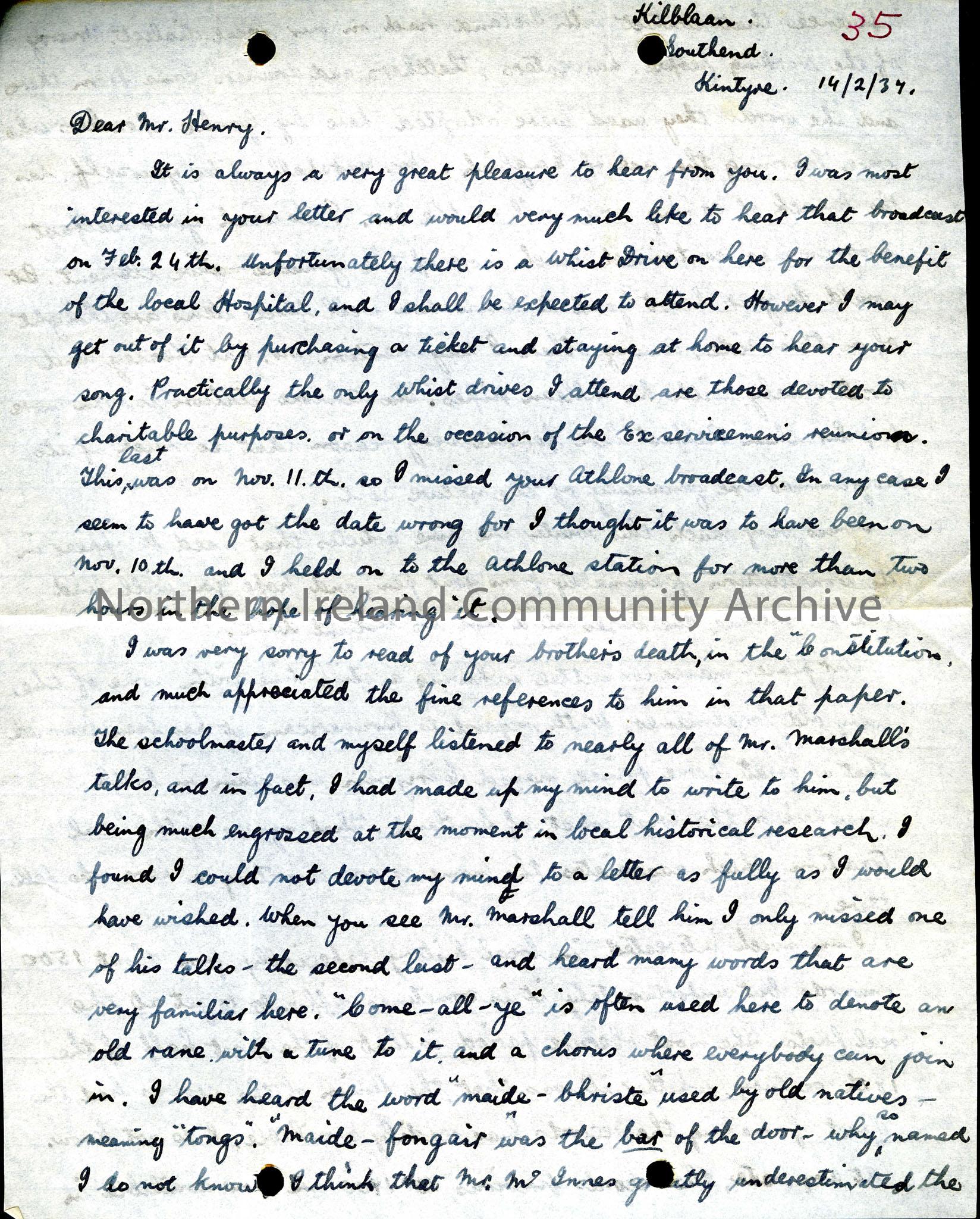 Letter From A. McEachran discussing the influence that contact with Ireland and the movement of population had on the local dialect in Kintyre.