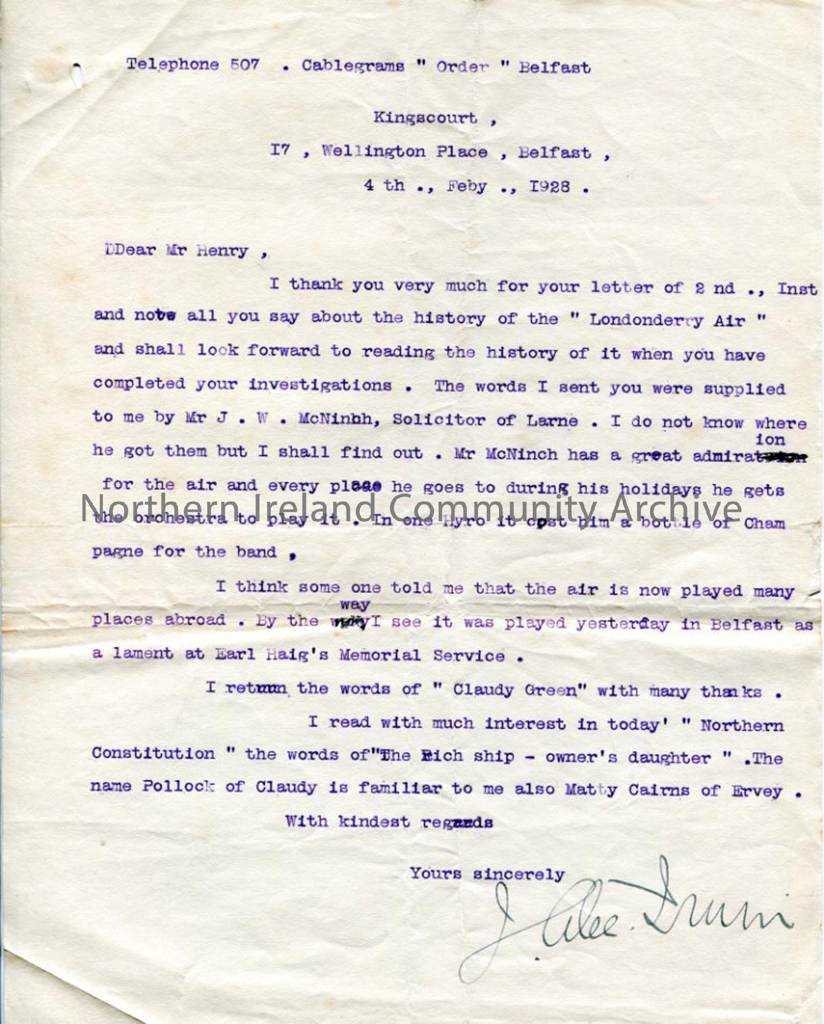 Carbon copy of typed letter to Sam Henry re: 'The Londonderry Air'. From Alec J Irwin, Belfast, 4.2.1928.