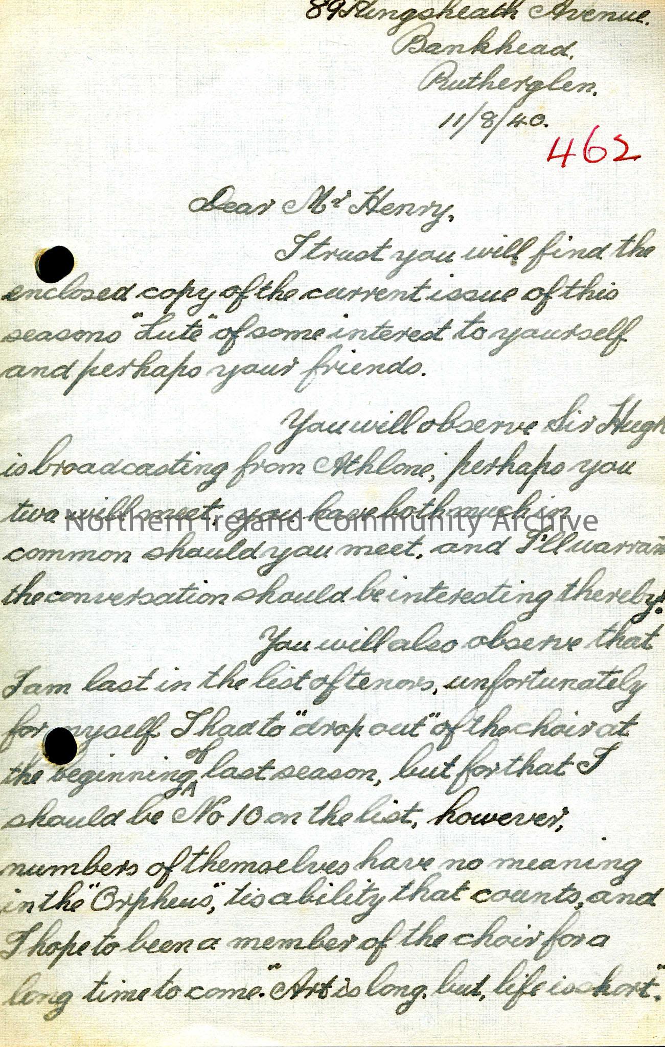 Letter from Alexander B Tod about an upcoming broadcast from Athlone and his role in the Orpheus choir.