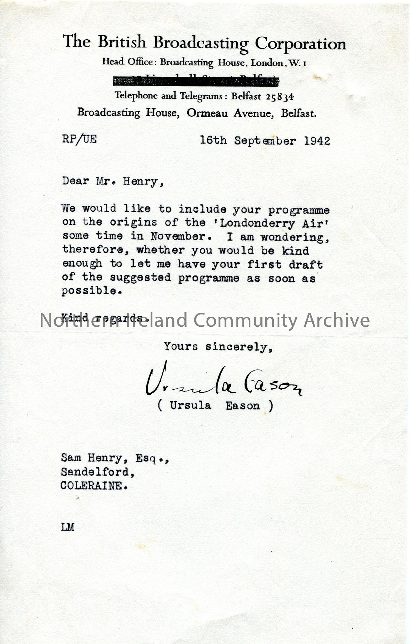 Letter from BBC re potential of broadcasting his material on the origins of the ‘Londonderry Air’ and asking him for draft script.