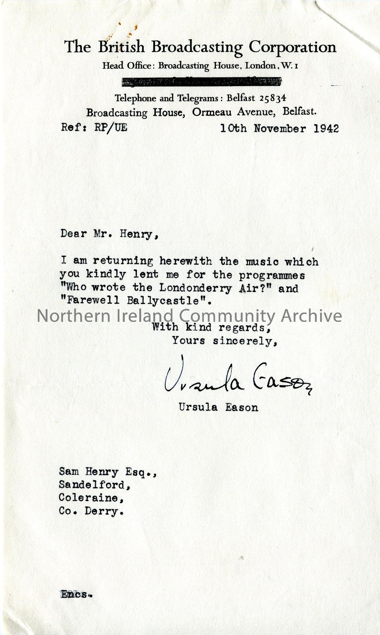 Letter from BBC, returning music on loan from Sam Henry for 2 programmes.