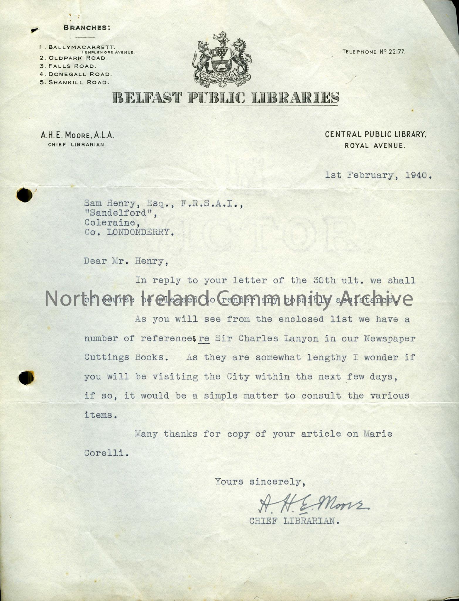 Letter from Belfast Public Library that enclosed a list of references to Sir Charles Lanyon in their Newspaper Cuttings Book. The writer thanked Sam Henry for his article on Marie Corelli.