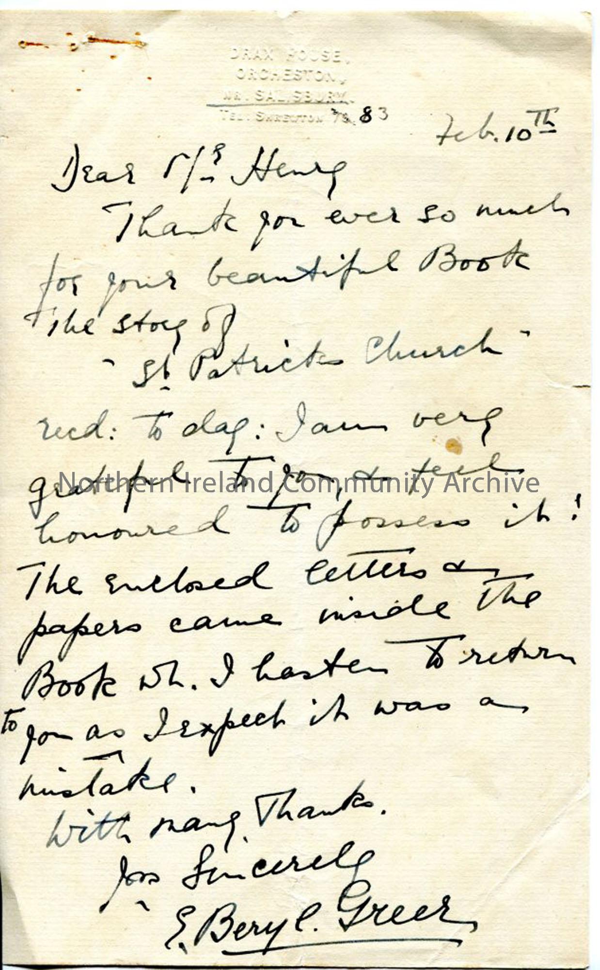 Handwritten letter from Beryl Greer, thanking Sam for book on St Patrick's Church. Dated 10th February.