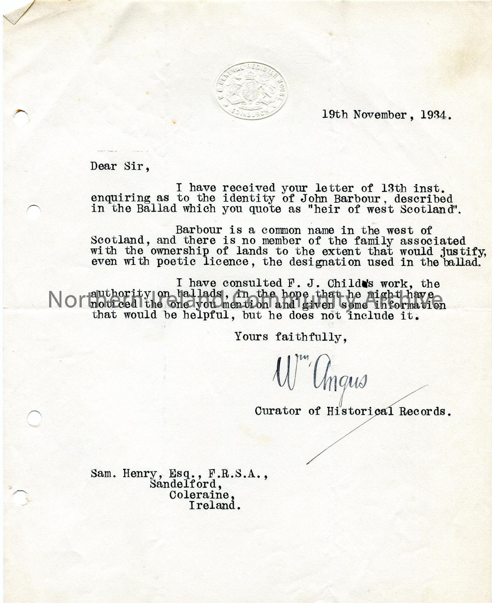 Letter from Curator of Historical Records in General Register House in Edinburgh, stamped with logo, answering query by Sam Henry over the name John Barbour in relation to a ballad.