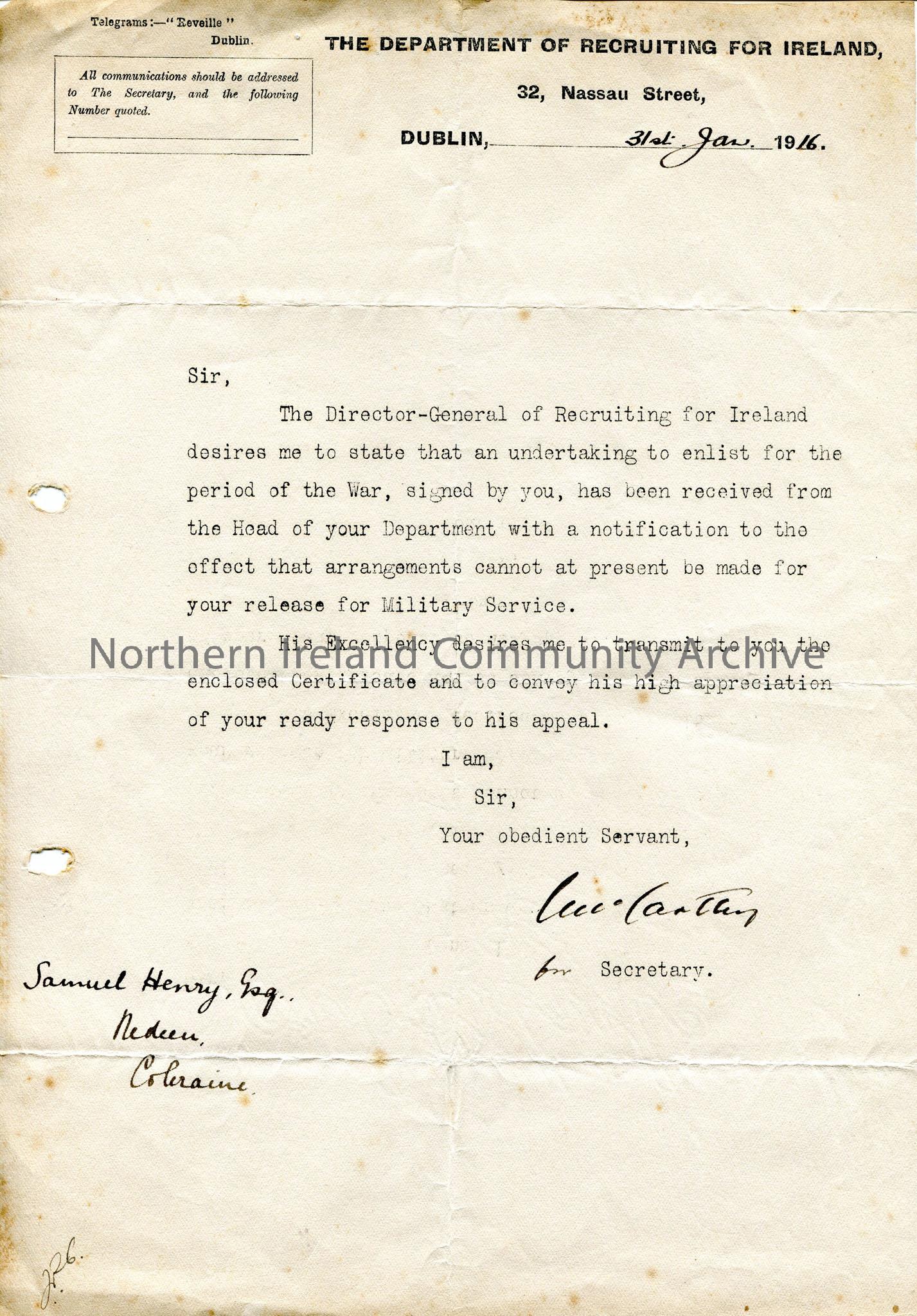 Letter from Department of Recruiting for Ireland – Sam cannot be released at present to enlist for War