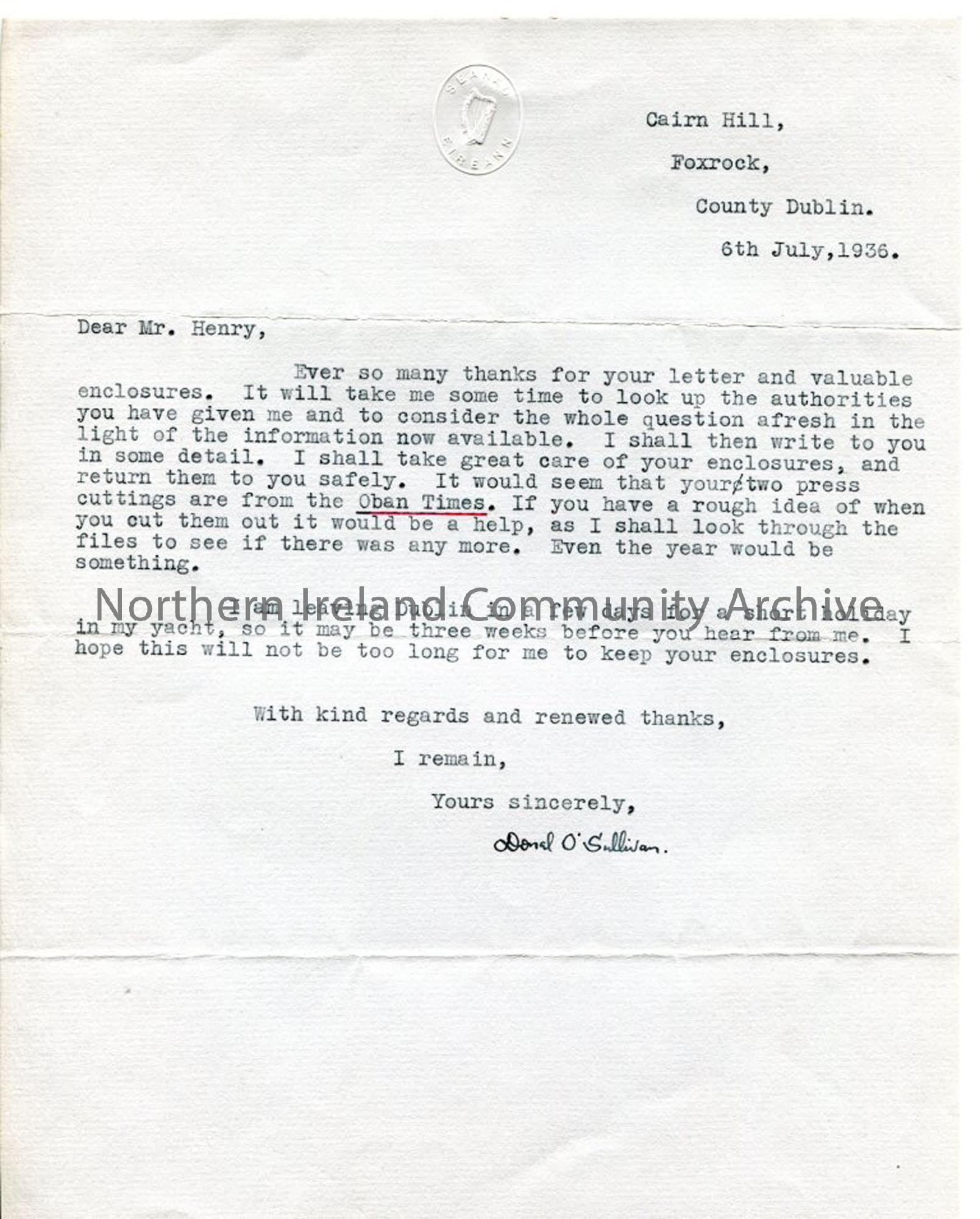 Typed letter from Donal O'Sulivan on Seanad Eireann [upper house of Irish Parliament] imprinted paper, re: information sent by Sam along with Scottish newspaper cuttings - possibly from the Oban Times. Dated 6.7.1936.