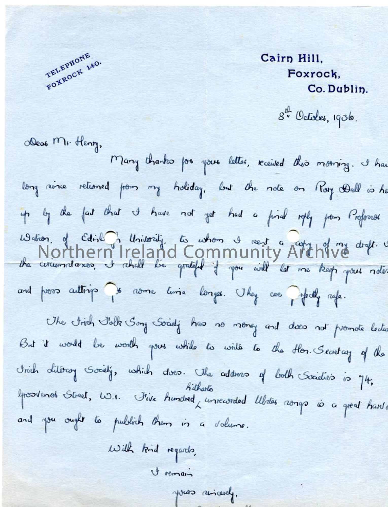Handwritten letter from Donal O'Sullivan on personal headed noted paper re information on Rory Dall, advice on giving lectures and comments on Sam's collection of songs. Dated 8.10.1936.