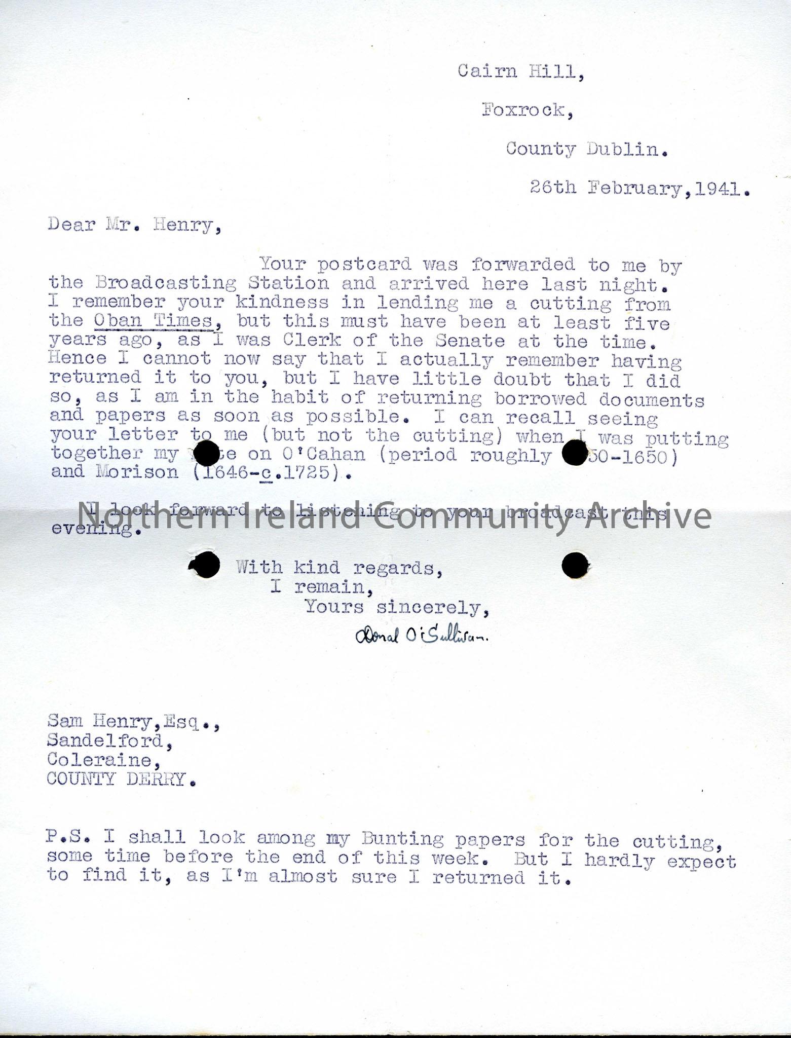 Letter from Donal O’Sullivan regarding a press cutting about Bunting lent to him by Sam Henry.