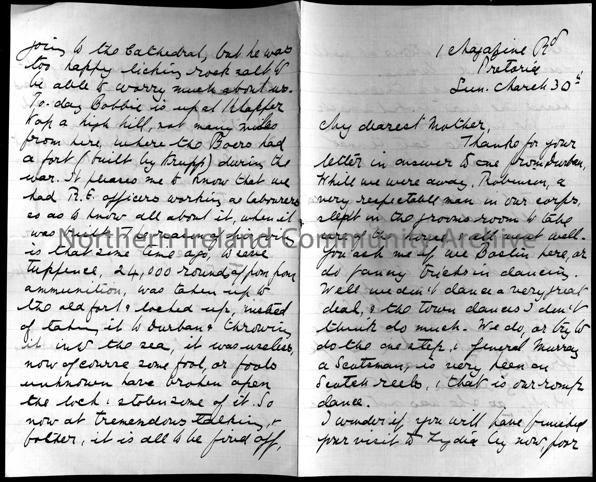 letter from Dorothy Arter Hezlet to her mother from 1 Magazine Road, Pretoria. Dated Sunday March 30th. Dorothy writes that she was in Durban, South Africa; various dances she has done; her dog Anna; she can not get Pomeroys liquid face powder where she lives; Bobbie went to Klopperkop fort, Pretoria where the Boers had a fort (built by Krupp) during the war, 24000 rounds of pom pom ammunition were stored at the fort but were stolen.