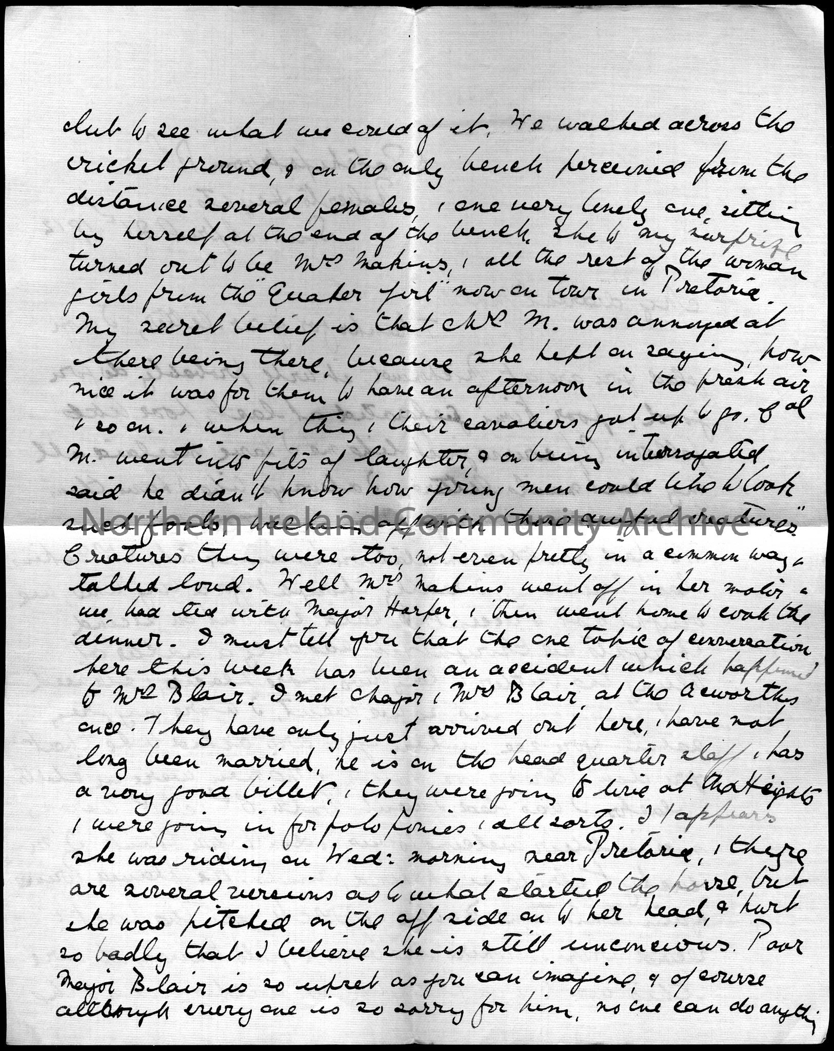 letter from Dorothy Arter Hezlet to her mother from Pretoria, Roberts Heights, dated Sun April 21st 1912. Dorothy writes that her mother is currently in Richmond. She writes of a Mrs Blair and her recovery after falling from a horse.
