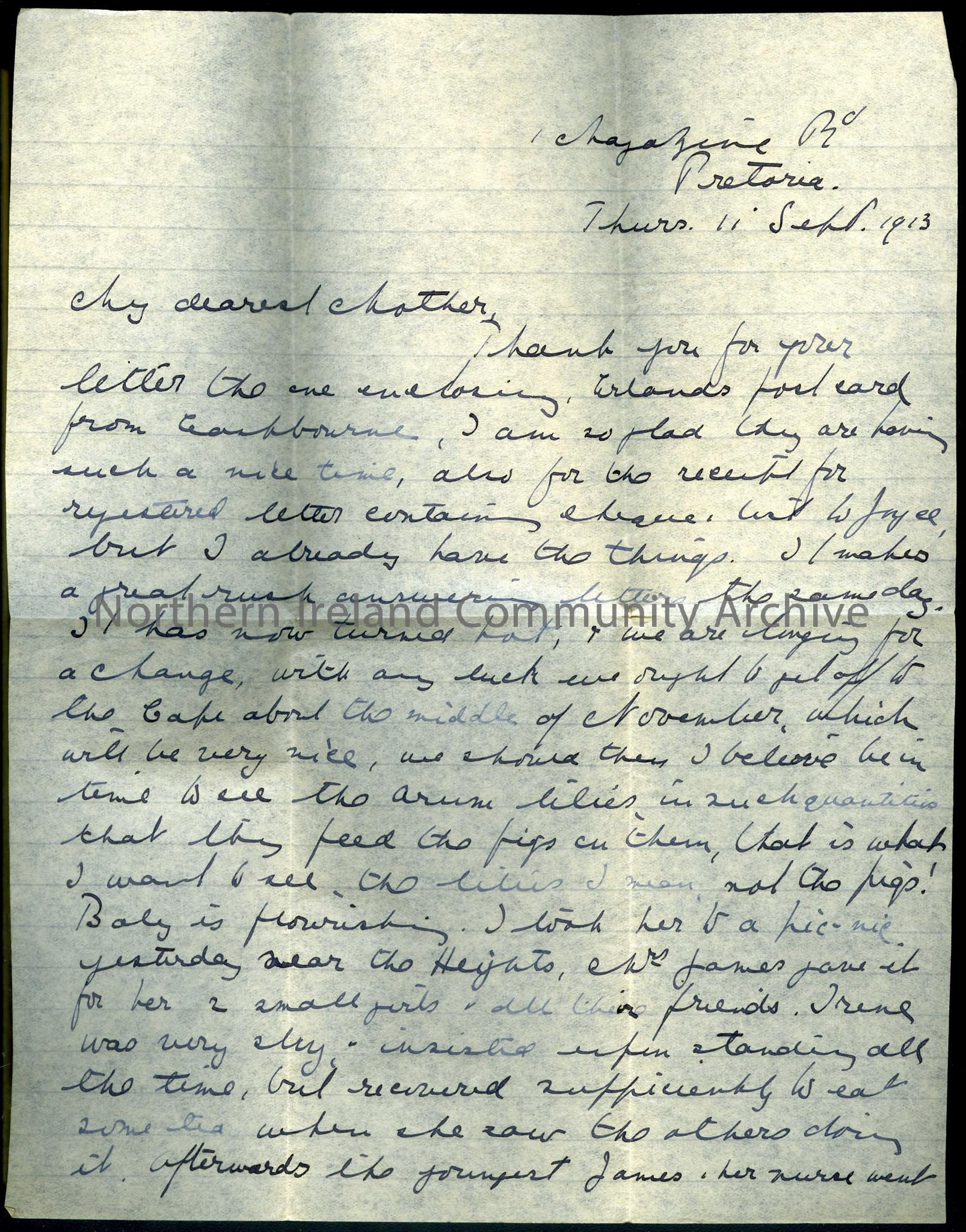 letter from Dorothy Arter Hezlet to her mother, sent from Pretoria, dated Thursday September 11th 1913, she speaks of taking her child Irene to Mrs Ja…