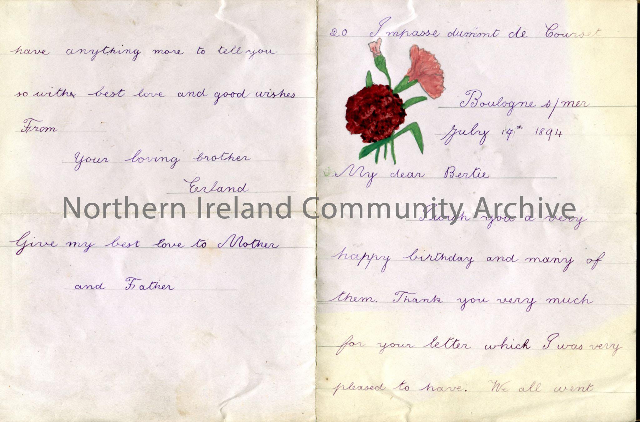 Letter from Erland to Bertie, wishing him happy birthday. Small hand drawn and coloured flower top left. Erland is in France and can swim across swimm…