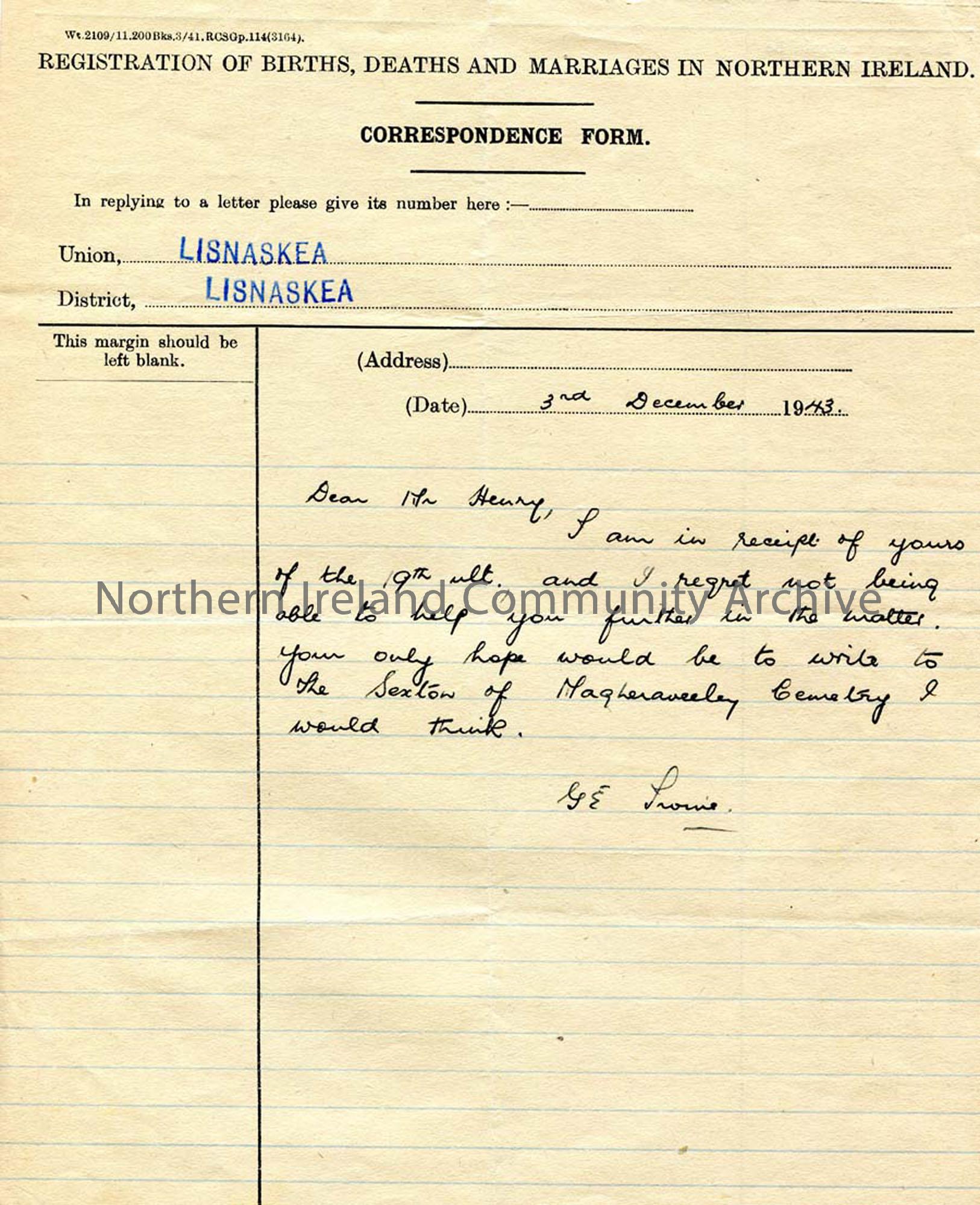 Handwritten letter to Sam Henry written on 'Registration of Births, Deaths and Marriages in Northern Ireland' correspondence form. Informs Sam they cannot help him further with an enquiry. Suggests writing to the Sexton of Magheraveely Cemetery. Sam has been asked by Dr James Johnston Abraham to help research his family tree for his autobiography.