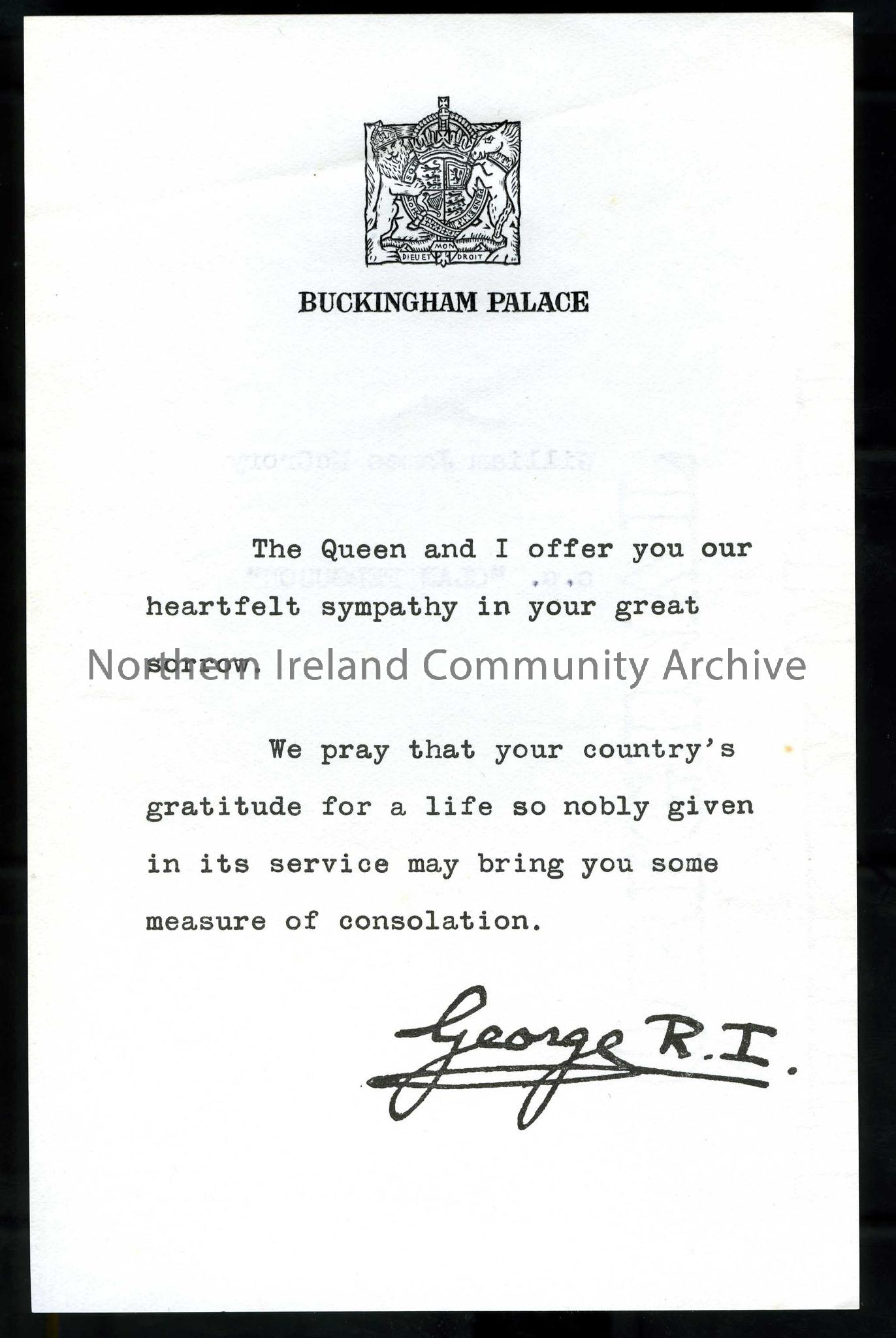 Letter from George R. I. Buckingham Palace. The Queen and King send their sympathy. On reverse William James McCrory, s.s. "Clan Ferguson".