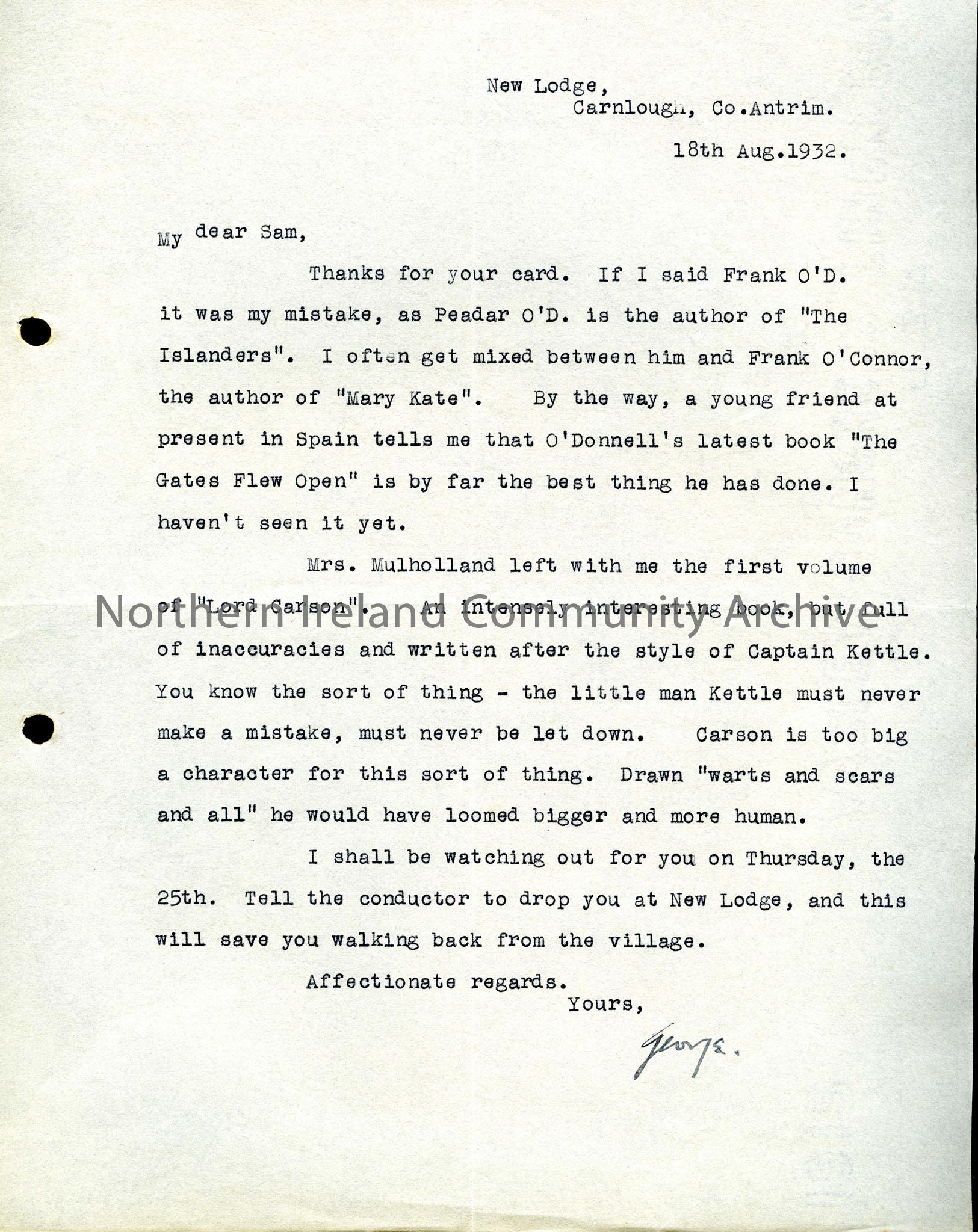 Letter from George W Shiels discussing plays and playwrights. Shiels also refers to a recent book on Lord Edward Carson that he states is interesting…