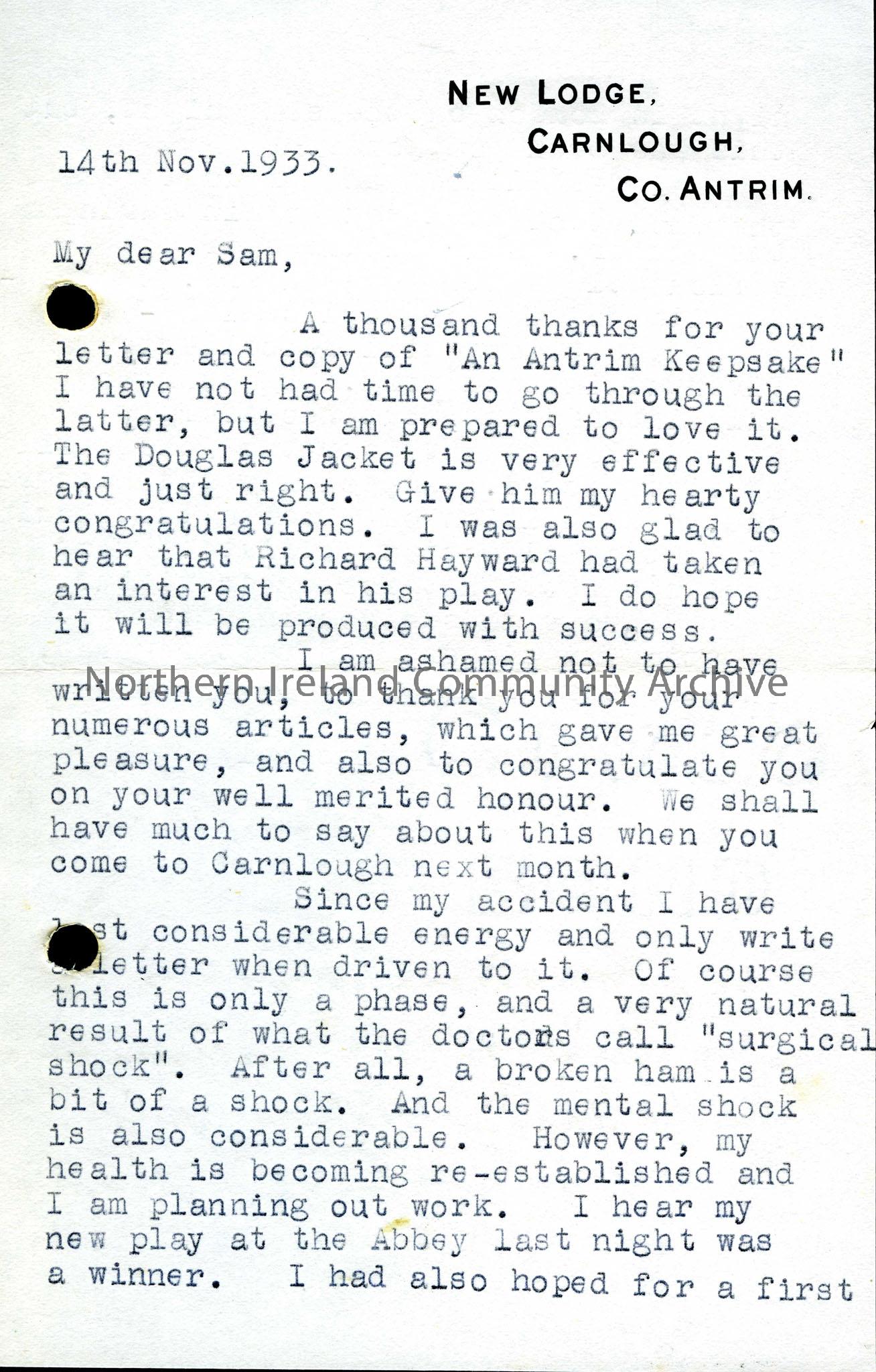 Letter from George W Shiels Thanking Sam for his letter and the copy of "An Antrim Keepsake", a book of songs compiled by Sam. He has heard that Richard Hayward is interested in producing one of James Douglas's plays and sends his congratulations. He mentions a broken leg from which he is recovering and talks of his new play which has been a hit at the Abbey theatre.
