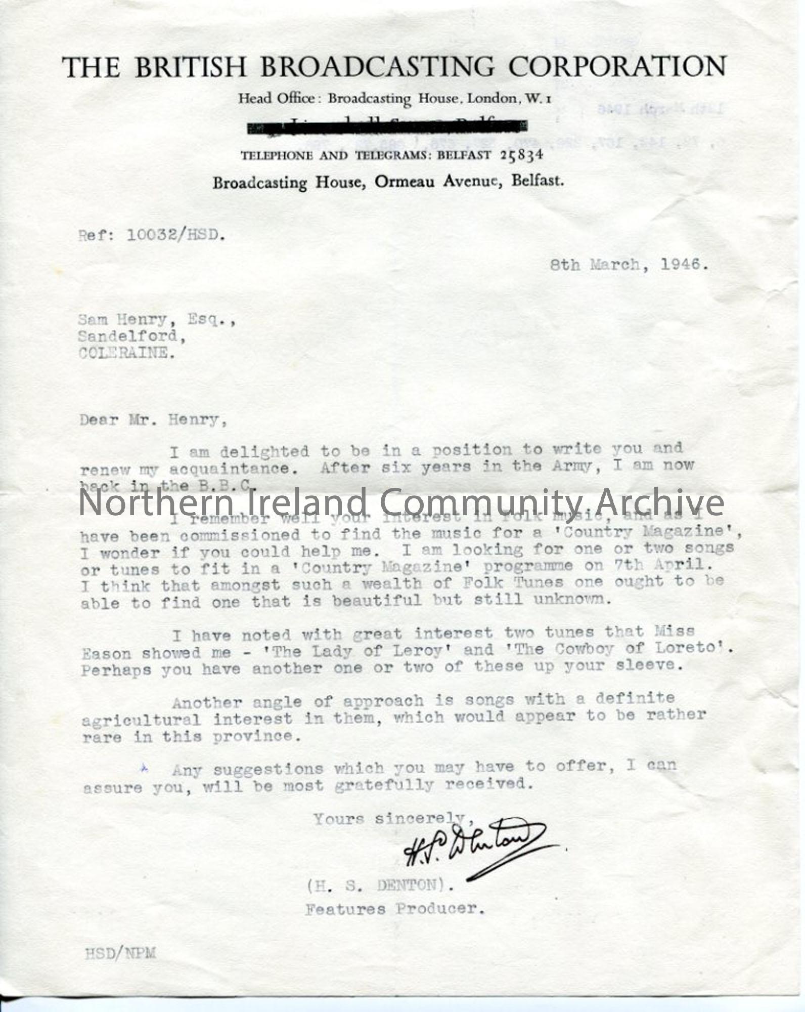 Letter from H. S. Denton - Featurers Producer for the BBC - he has returned from war service and is interested in renewing acquaintance with Sam for folk song inclusion in new 'Country Magazine' programme. Dated 8.3.1946.