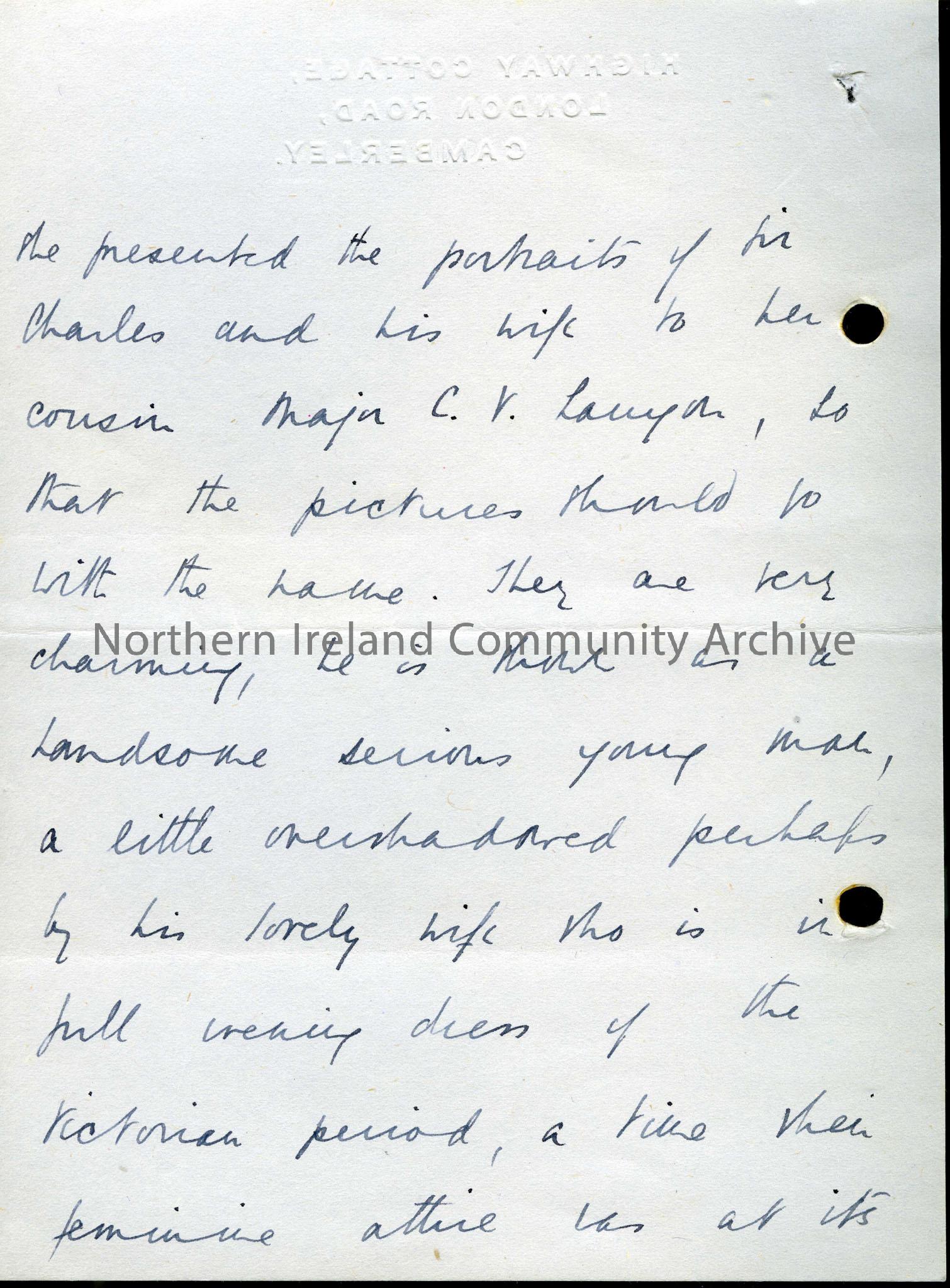 Letter from Helen Donovan, formerly Lanyon,discussing family portraits that her daughter Joan gave to her cousin, Major C.V. Lanyon. She suggests Sam Henry contact Mrs. Westropp, grand-daughter of Sir Charles.