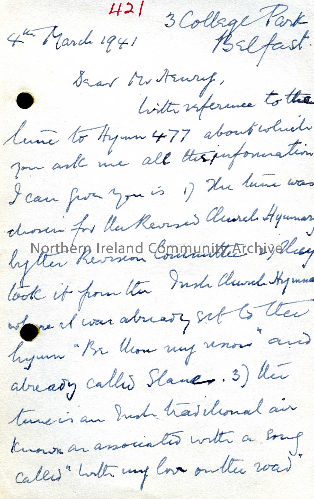 Letter from J Ernest Davey in response to a question from Sam Henry about the tune to hymn 477, “Be Thou My Vision”.