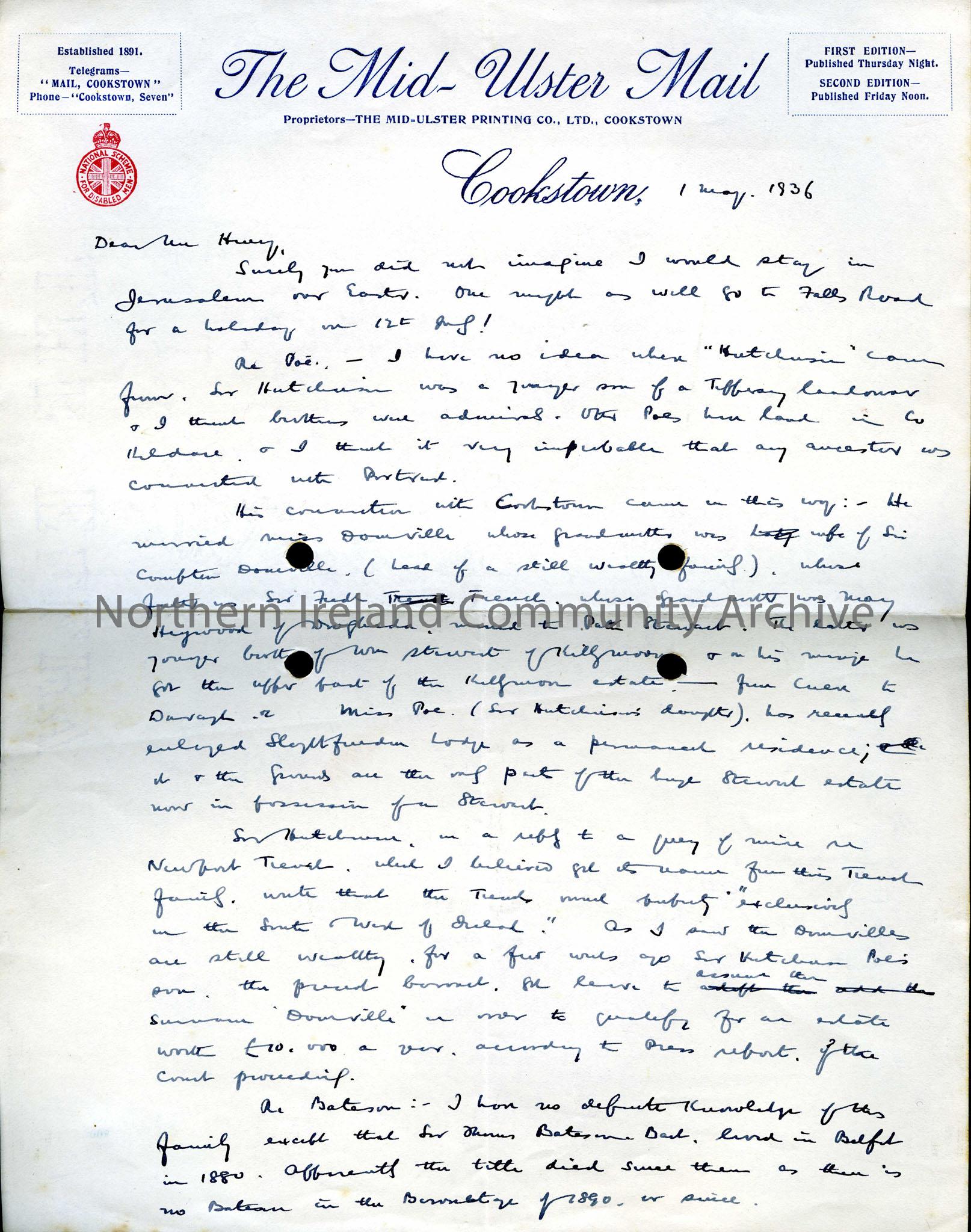 Letter from J. M. Glasgow of the Mid-Ulster Mail regarding the Poe family. He mentions several names including Hutchinson, Domville, Stewart, Trench…