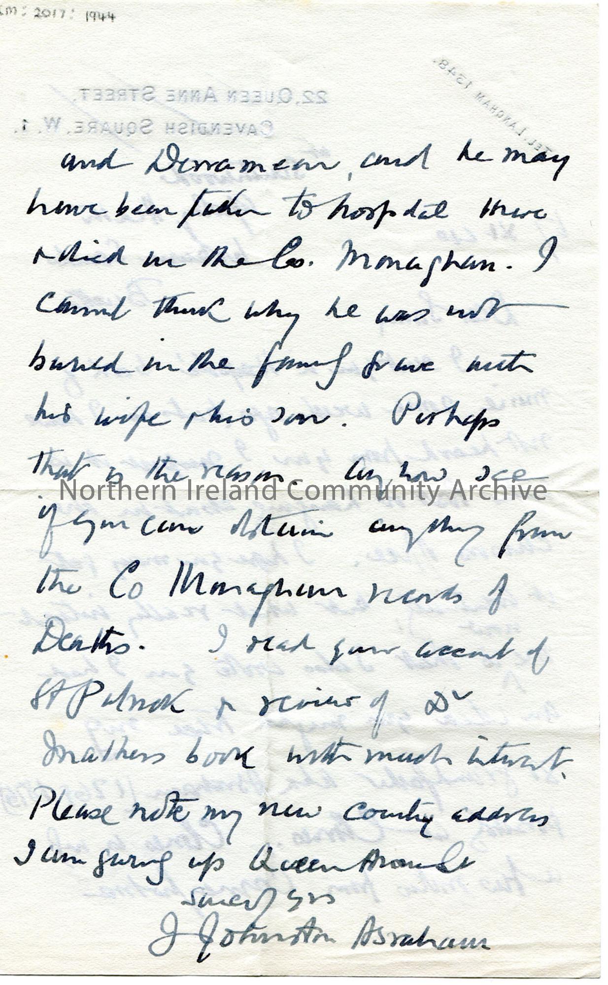 Handwritten letter (double sided) to Sam Henry. Re Sam's help in tracing the Abraham family tree. Has not heard from Sam about the Harpole book he sent weeks ago. Asks Sam to check the death Register at Monaghan. Read Sam's account of St.Patrick and review of Dr Mather's book. He points out his new 'country' address and is 'giving up' on Queen Anne Street.