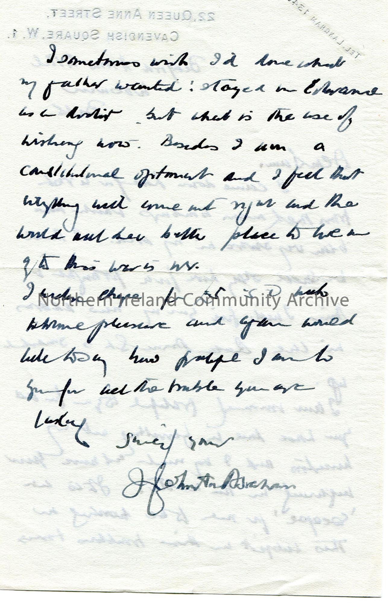 Handwritten letter to Sam Henry. He is staying out of London due to the bombings [World War II]. Thanks Sam for the work he has put into helping research his family tree and finds it an 'escape' from the 'troubled times'. Writes that he sometimes wishes he stayed in Coleraine as an artist. Encloses cheque for £5.0.0 for Sam's work he has carried out.